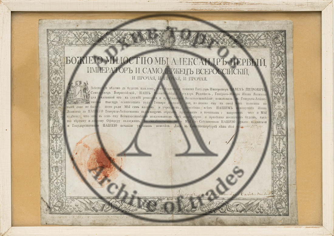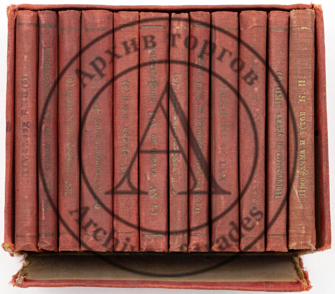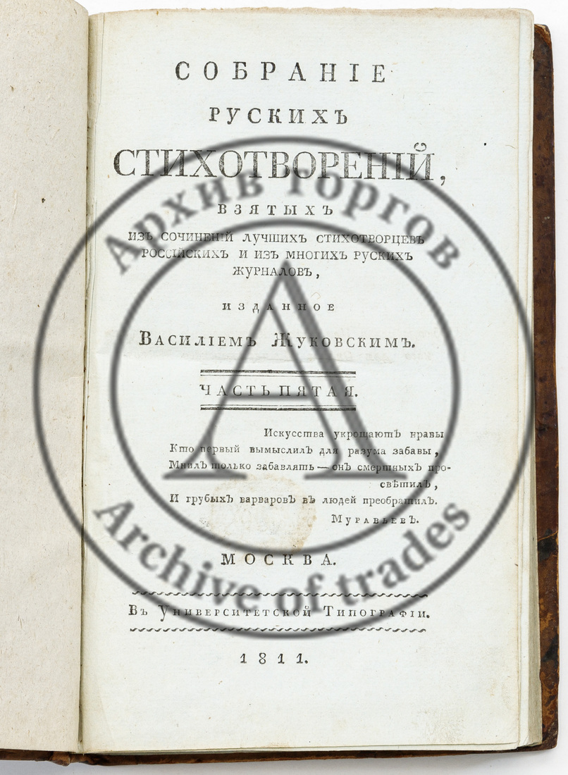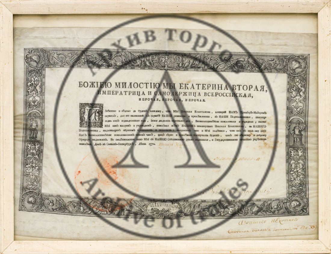 В заключительном букинистическом разделе, кроме книжных редкостей, таких как иллюстрированное издание поэмы А. С. Пушкина «Руслан и Людмила» с рисунками Малютина (лот 322, старт 25 000 ₽), или издания, представляющего особый интерес также и для нумизматов — Нагуевский Д. И. «Обозрение персидских монет, хранящихся в Нумизматическом музее Казанского университета» (лот 333, старт 10 000 ₽), — представлены два редчайших документа о присвоении чинов с подписями русских монархов: с автографом Екатерины II — «Патент на чин подполковника», 1770 г. (лот 447, старт 180 000 ₽) и с автографом Александра I — «Патент на чин генерал-лейтенанта», 1802 г. (лот 448, старт 150 000 ₽).