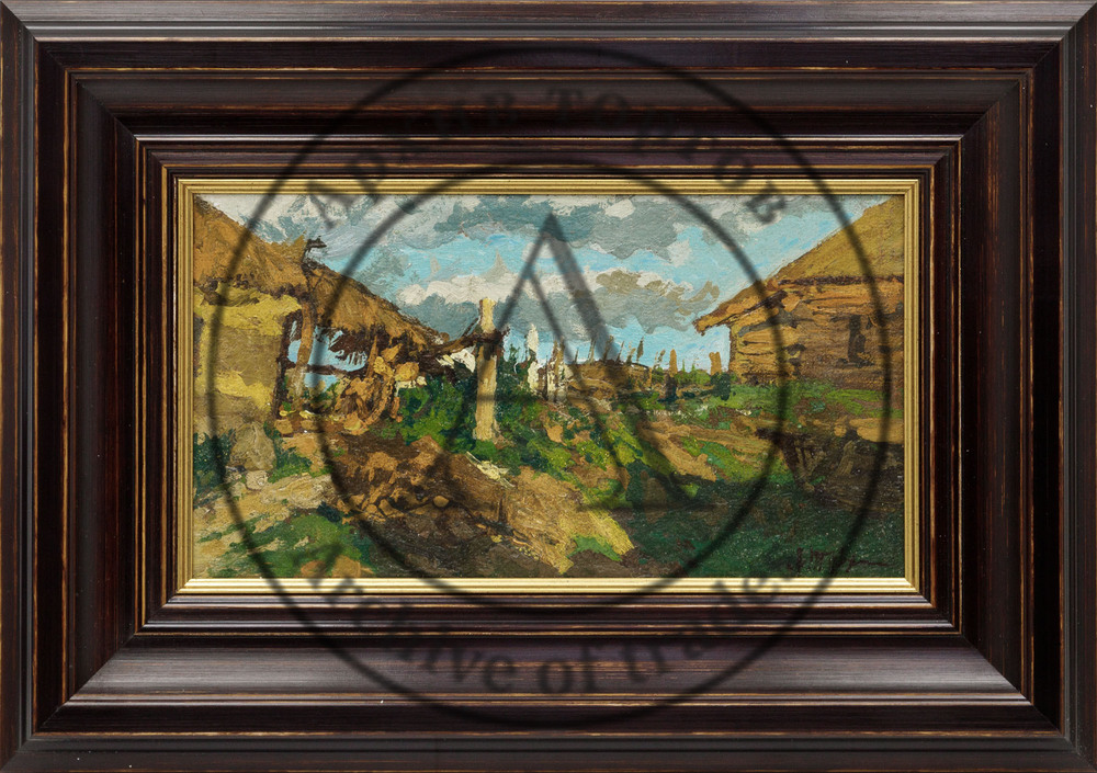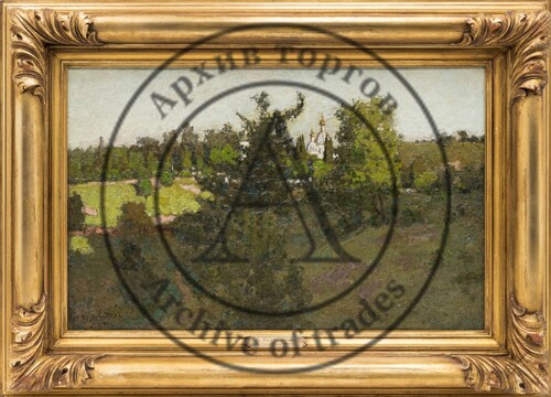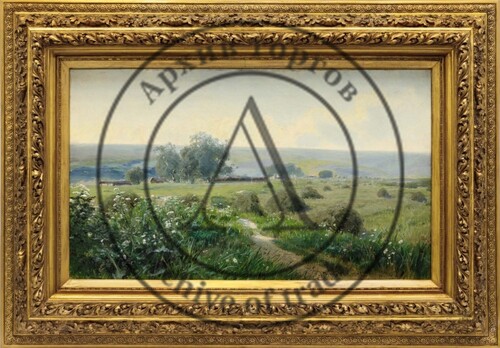 Ещё один замечательный пейзажист, ученик Поленова — Г. Ф. Ярцев, — представлен панорамным летним пейзажем 1893 г. Изображён пик лета, его «макушка»: высокие сочные травы скошены и собраны в зелёные стога, на переднем плане цветут лопухи и кашка, вдали виднеется обрыв к реке, а в воздухе висит испарина жаркого дня (лот 23, старт — 2 300 000 руб.).