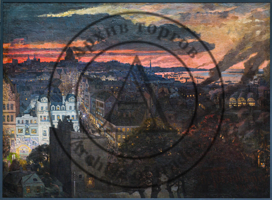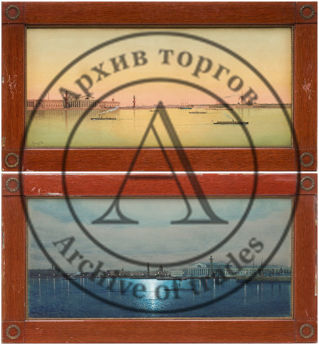 Продолжая морскую тему, столь популярную у русских художников, отметим парные ведуты Петербурга, написанные художником Ф. Ф. Клименко в 1916 г. Это две тщательно проработанные акварели: одна — с ночным видом на Стрелку и Биржу Васильевского острова и берег Дворцовой набережной; вторая написана в рассветный час с противоположной точки и раскрывает панораму Стрелки и Петропавловской крепости. Дивная мерцающая гладь Невы с маленькими пассажирскими пароходиками, горящие газовые огни, выбеленное небо белых ночей, необыкновенно прекрасные архитектурные декорации города, созданные гением разных зодчих — два парадных вида северной столицы в неоклассических рамах эпохи (лот 16, старт — 1 600 000 руб.).