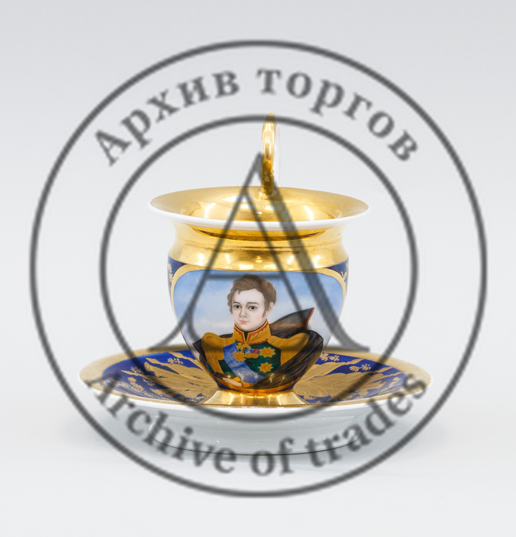 Чайная пара с портретом героя Отечественной войны 1812 года, светлейшего князя И. Ф. Паскевича, выполнена на заводе Гарднер в 1820-е гг. и имеет абсолютно уникальный статус. За образец был взят портрет Паскевича, написанный Дж. Доу для Портретной галереи 1812 года в Зимнем дворце. Форма чашки в стиле позднего ампира дополнена высокой ручкой. Тулово и блюдце покрыты синим кобальтом и декорированы венками с мотивами русского оружия и доспехов (лот 49, старт — 650 000 руб.).