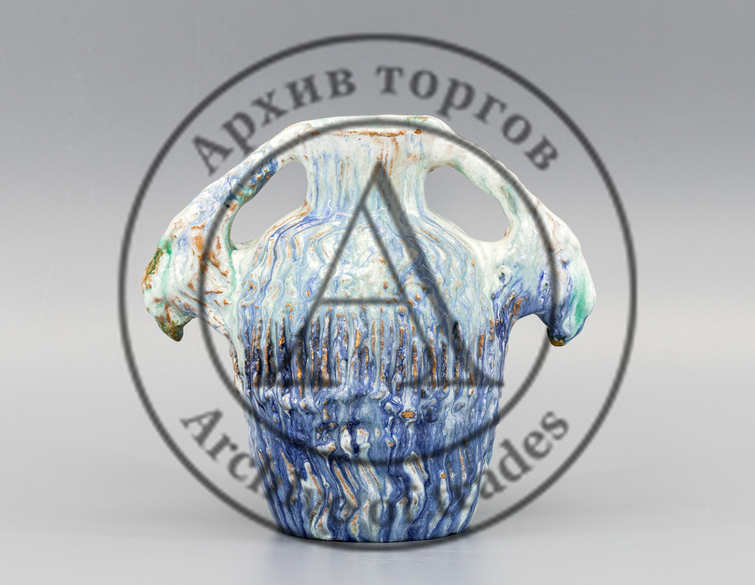 Абрамцевская керамическая ваза с майоликовыми глазурями трёх оттенков, 1890-х гг., — уникальный предмет: даже при повторении формы глазури всегда выходят разными, их точное воспроизведение технологически невозможно (лот 48, старт — 500 000 руб.).