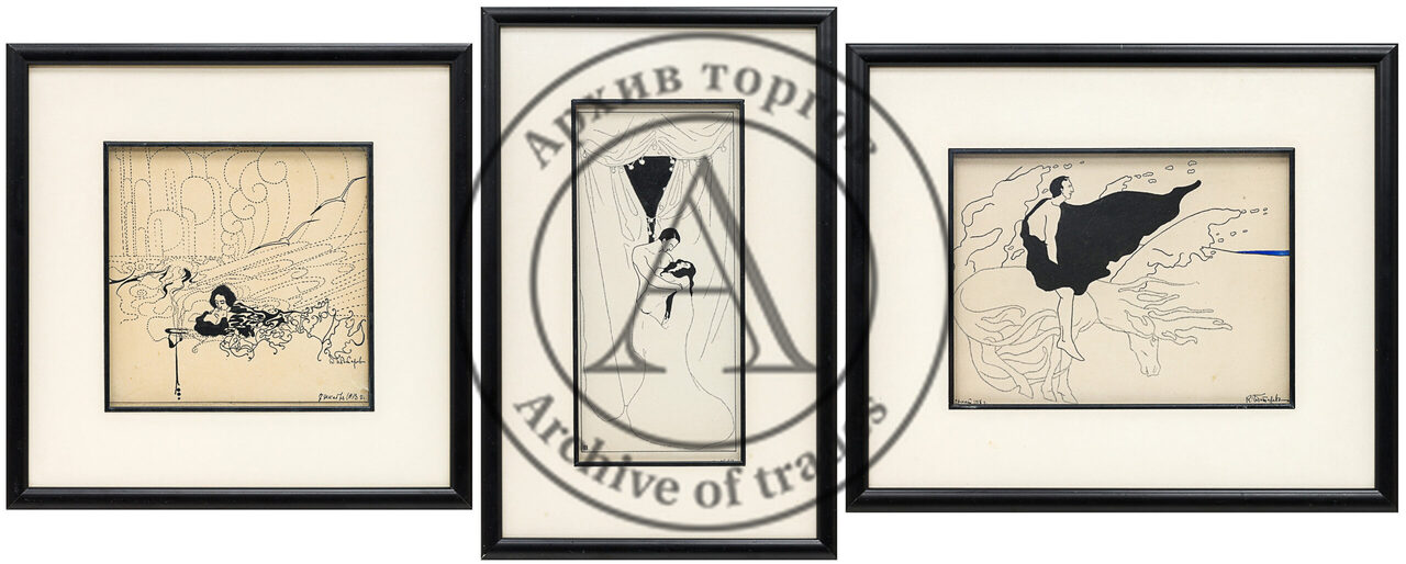 Триптих К. К. Чеботарёва объединяет три разных рисунка тушью, созданных около 1913 года и овеянных стилистикой символизма. Возможно, у них есть поэтическая или литературная основа, которую не удалось установить (лот 31, старт — 600 000 руб.).