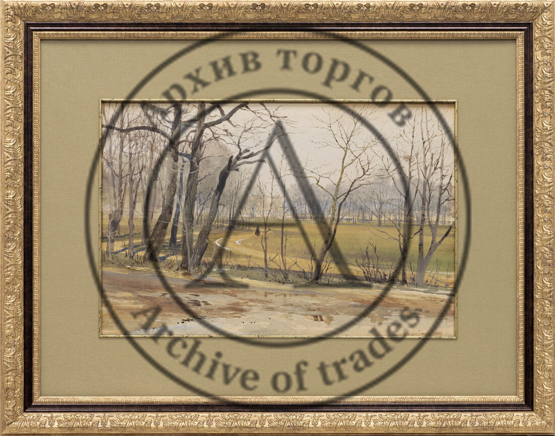 Акварель Альберта Бенуа «В парке» (1899 г.) с обнажёнными деревьями, чуть виднеющимся за стволами дворцом вдали и одинокой стафажной фигурой на дорожке написана, возможно, в окрестностях Павловска (лот 20, старт — 540 000 руб.).
