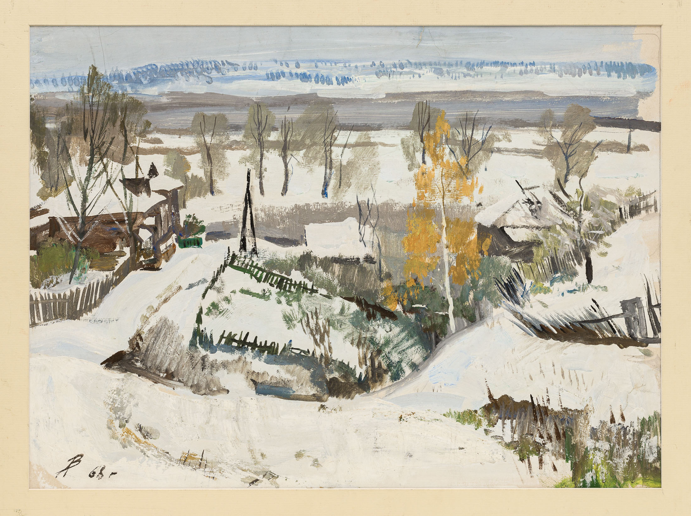 Другой топ‑лот аукциона — картина художника Владимирской школы К. Бритова «Мартовский вечер», 1969 г. Пейзаж написан на пике художественной карьеры мастера, которая пришлась на 1960–70‑е гг.; в нём сочетаются те самые запоминающиеся яркие и звенящие сочетания горящего жёлтого и лазурного синего (Лот 37, старт 1 400 000 руб.).