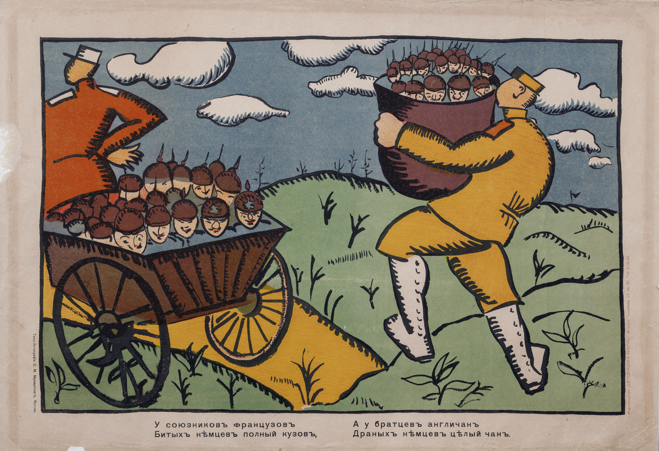 Автор текста В. Маяковский. М.: Издательство «Сегодняшний лубок»; Типо-Литография С.М. Мухарского, [1914]. Бумага, хромолитография. Размер 37,5 Х 55,7 см. Лист наклеен на лист бумаги, загрязнения.