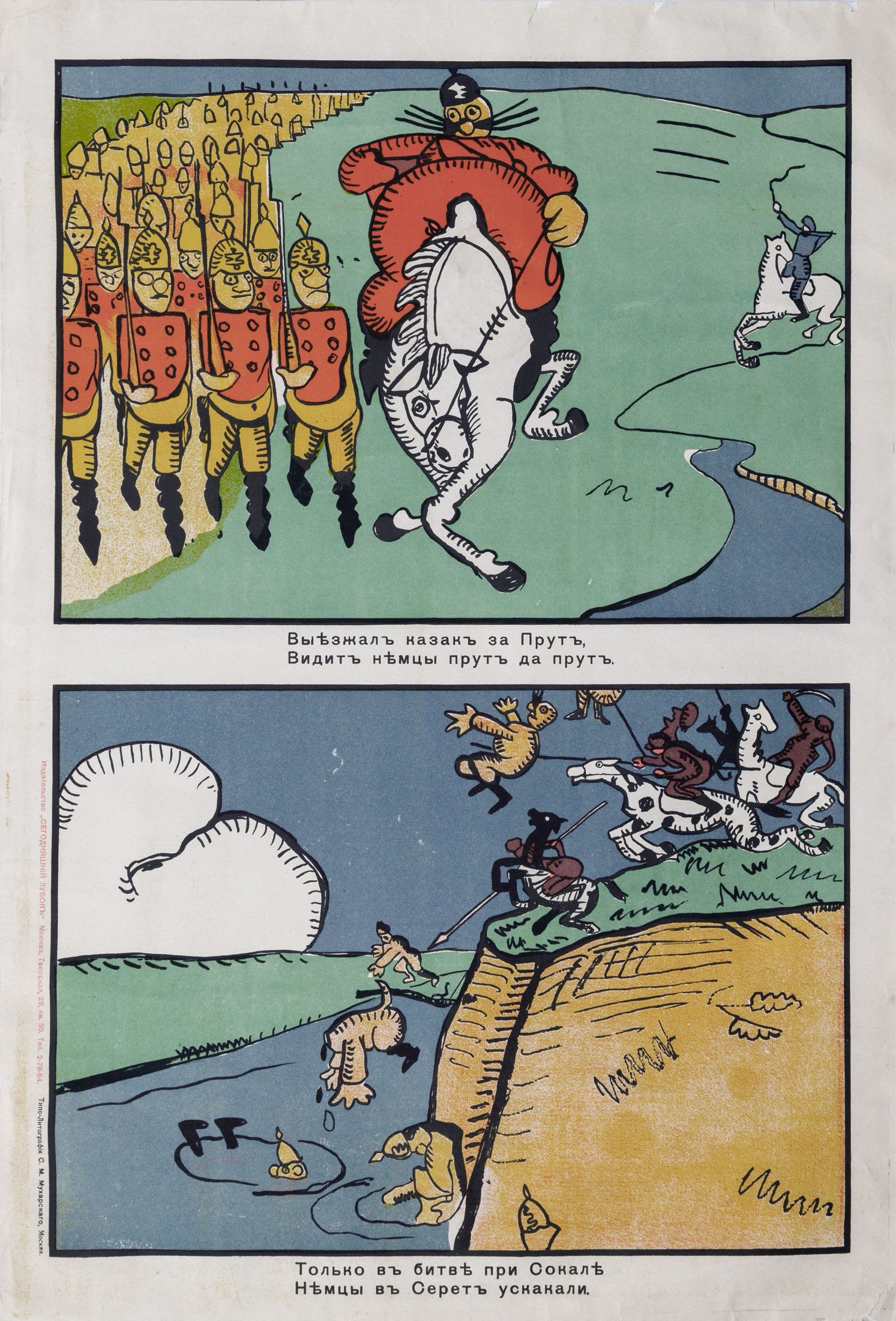 Лубочный плакат ««Выезжал казак за Прут, / Видит немцы прут да прут / Только в битве при Сокале / Немцы в Серет ускакали»