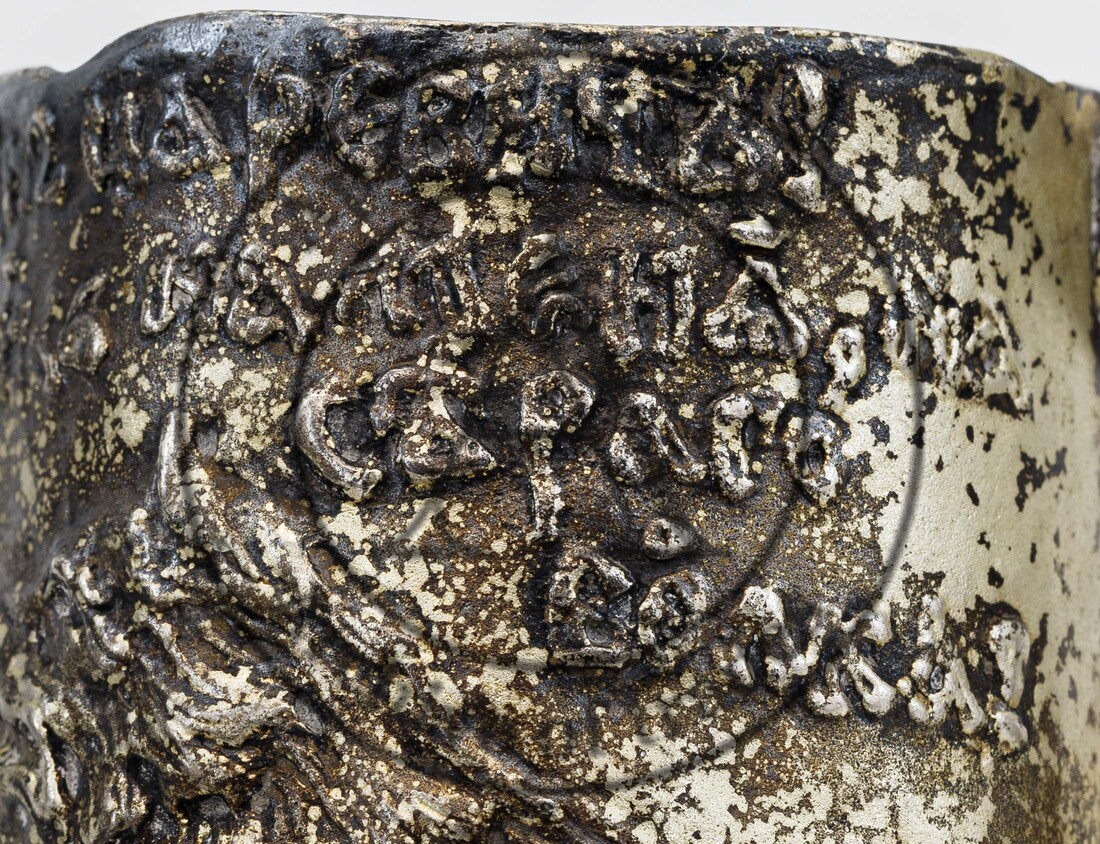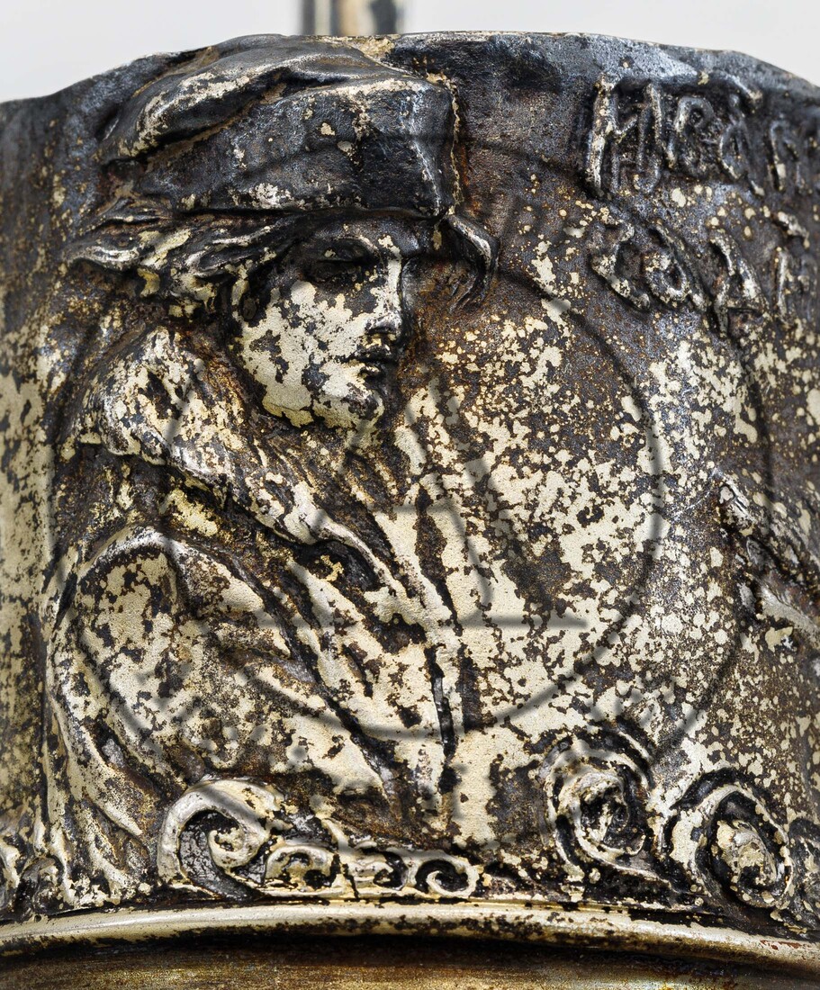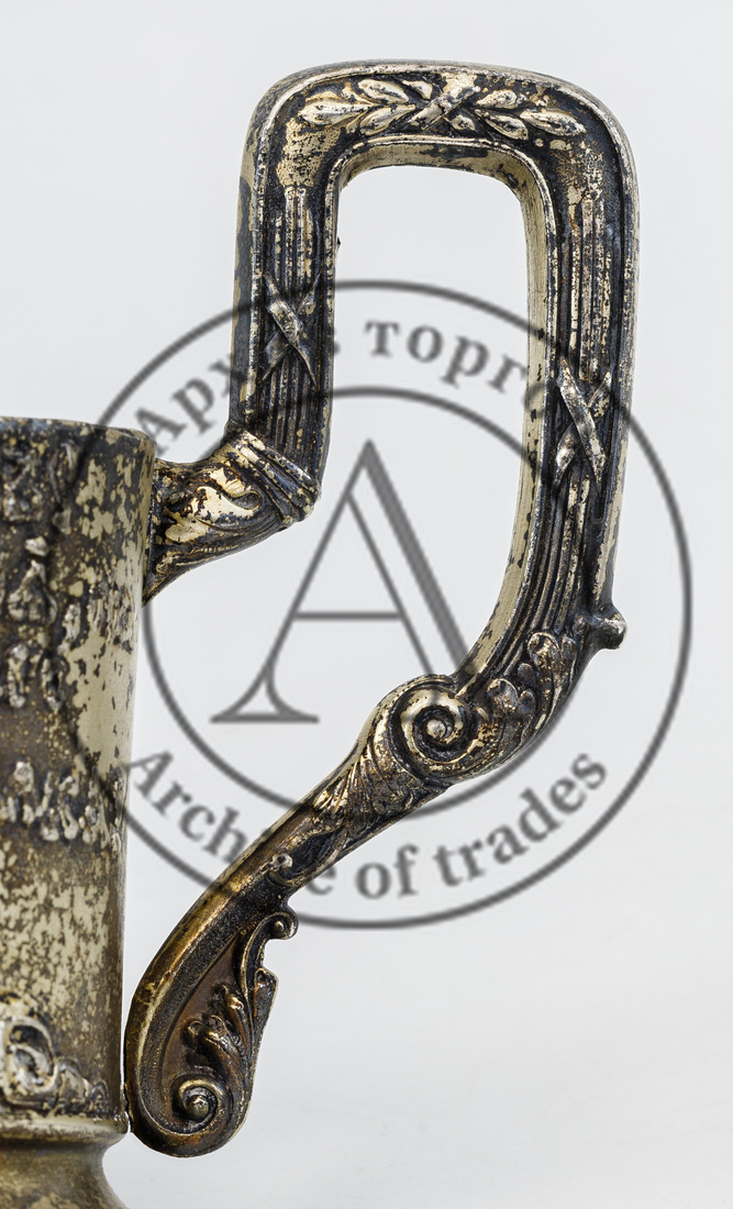 Сохранность: патина, деформация «юбки», трещина на стыке ручки и стенки, трещина на ручке.