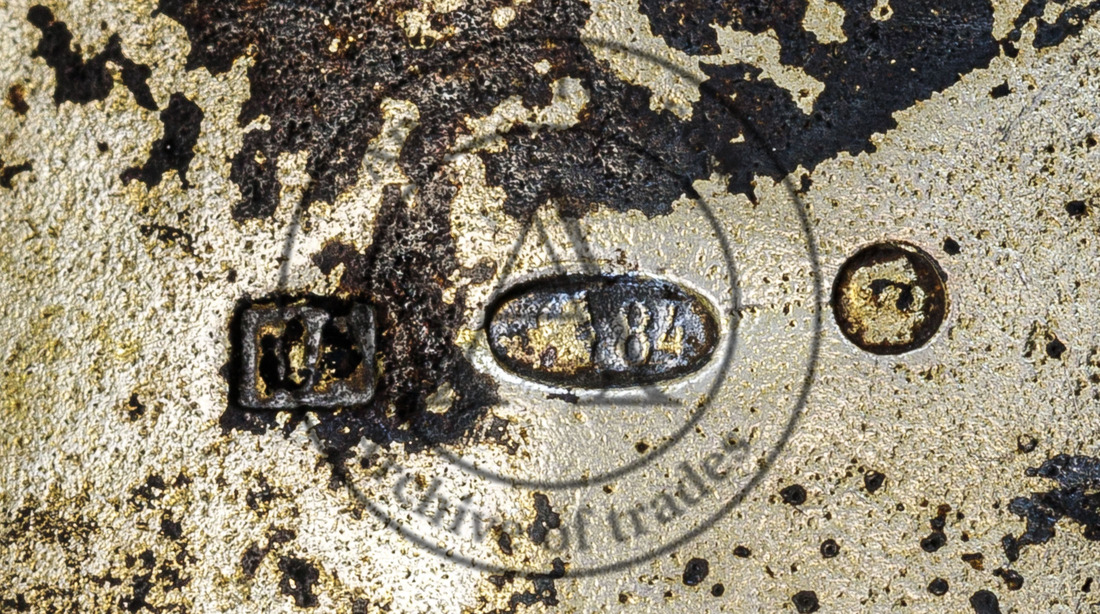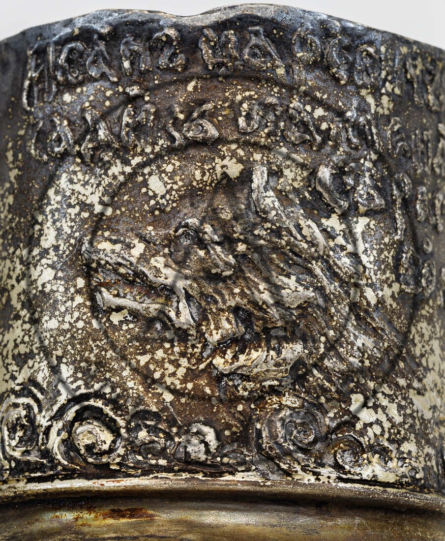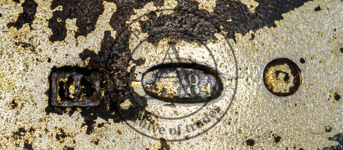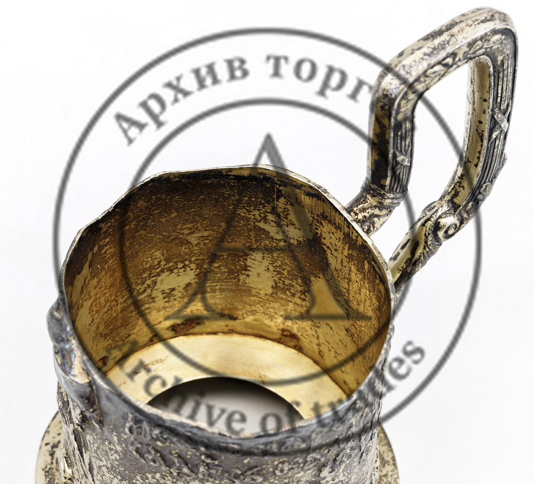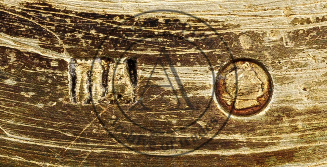 Клейма: 1) 84-й пробы «женская голова в кокошнике, обращенная вправо, в овальном щитке с шифром московского пробирного округа (дельта)»; 2) «женская голова в кокошнике, обращенная вправо, в круглом щитке с одной точкой внизу слева от головы»; 3) именник «ПА» в прямоугольном щитке.