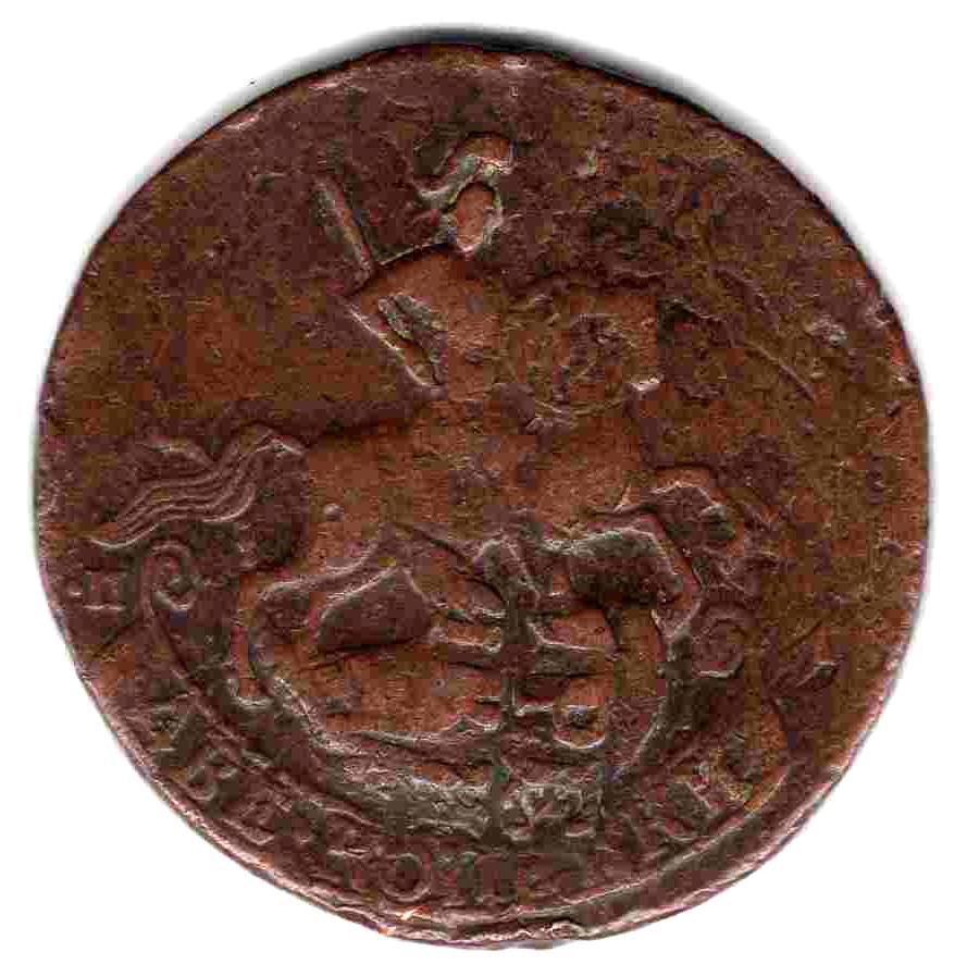 Перечекан с 4 копеек «Барабаны». Видны четкие следы исходной монеты.