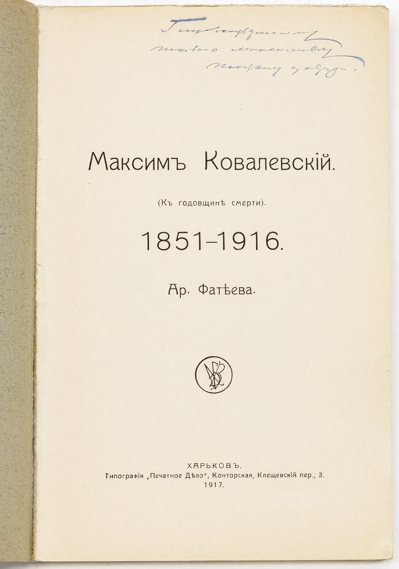 [Автограф автора] Фатеев А.Н. Максим Ковалевский (К годовщине смерти): 1851-1916