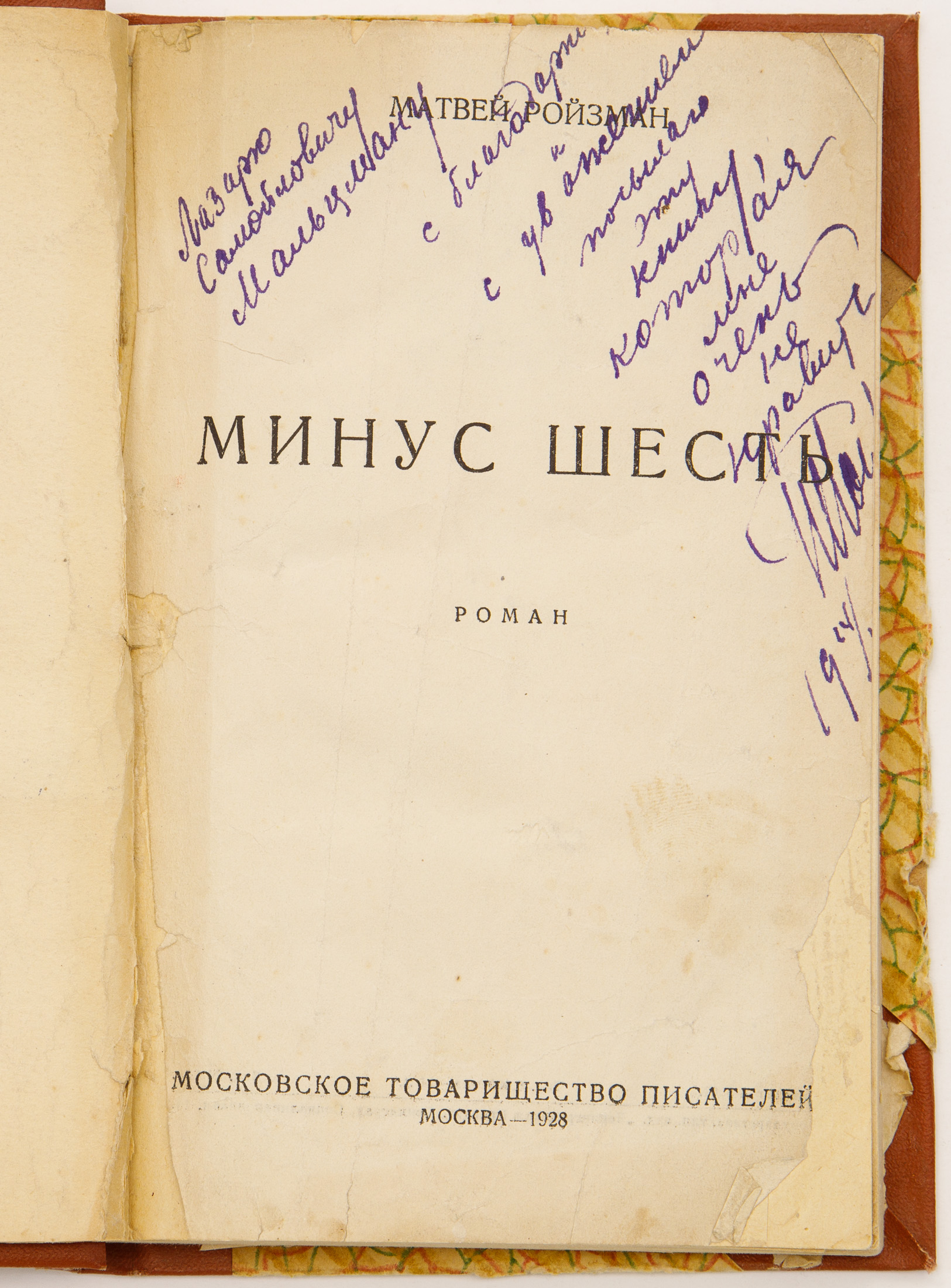[Автограф автора] Ройзман М.Д. Минус шесть: Роман