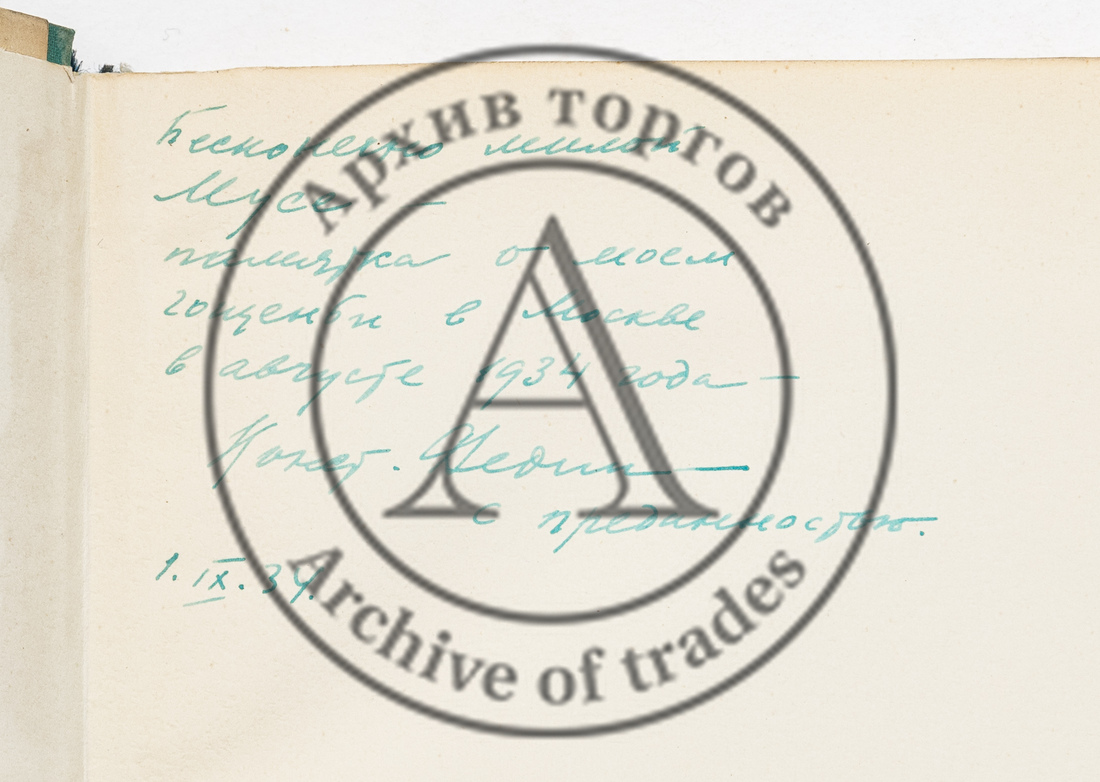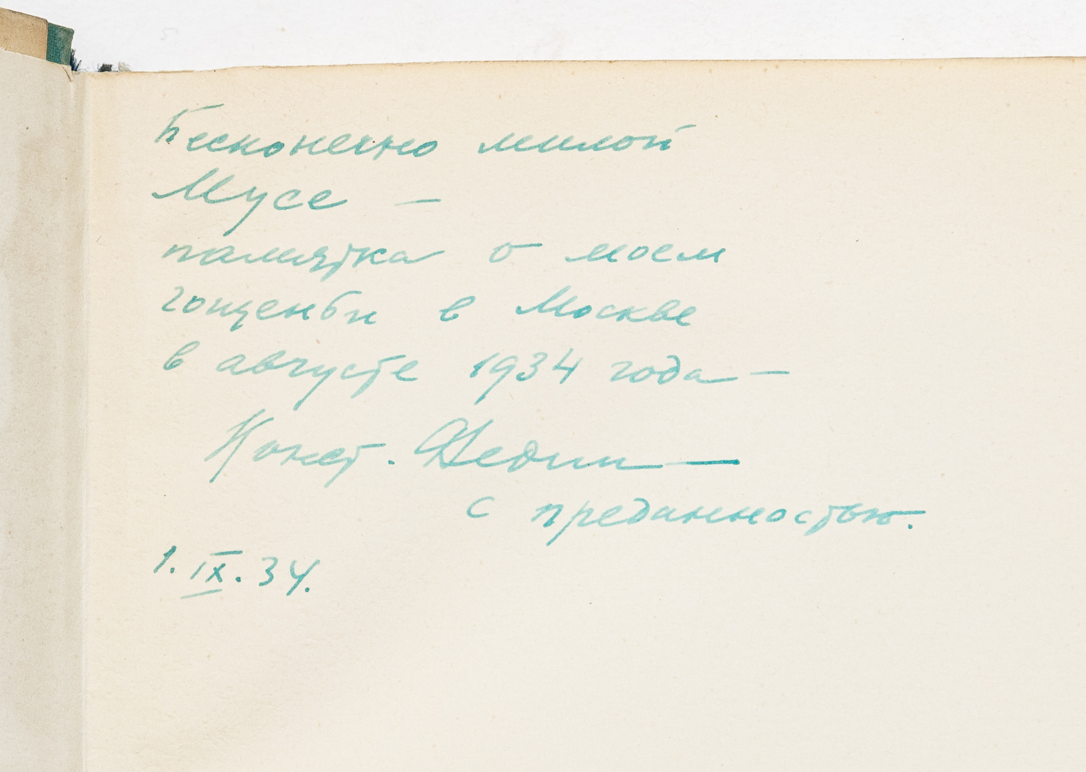 На форзаце автограф К.А. Федина: «Бесконечно милой Мусе – памятки о моем гощеньи в Москве в августе 1934 года – Конст. Федин – с преданностью. 1.IX.34».