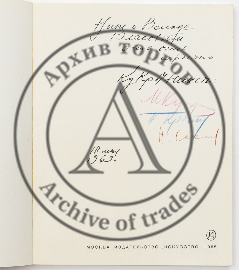 На первом листе дарственная надпись: «Нине и Володе Власовым очень, очень сердечно Кукрыниксы: М. Куприянов П. Крылов Н. Соколов 10 мая 1969 г».