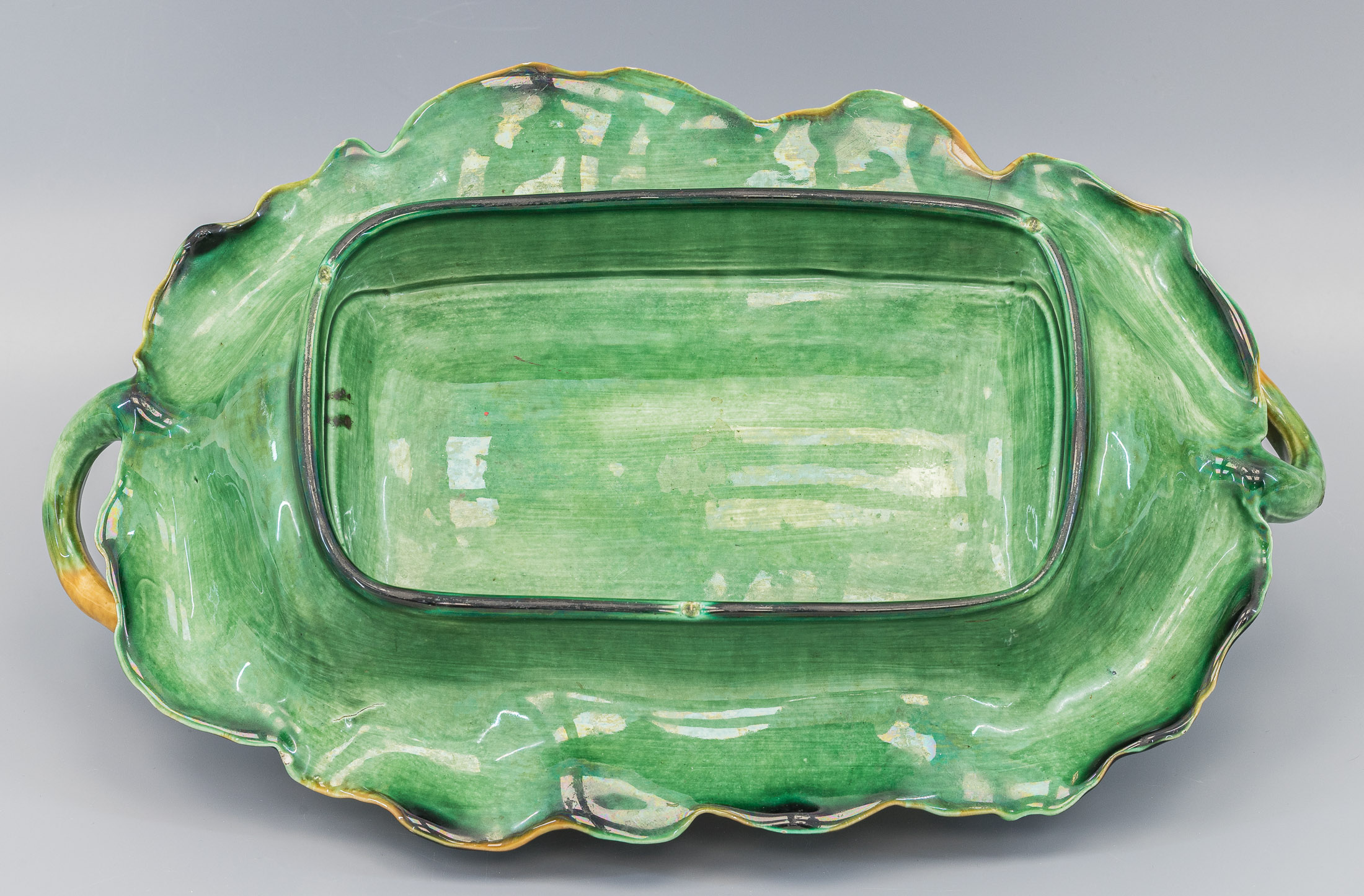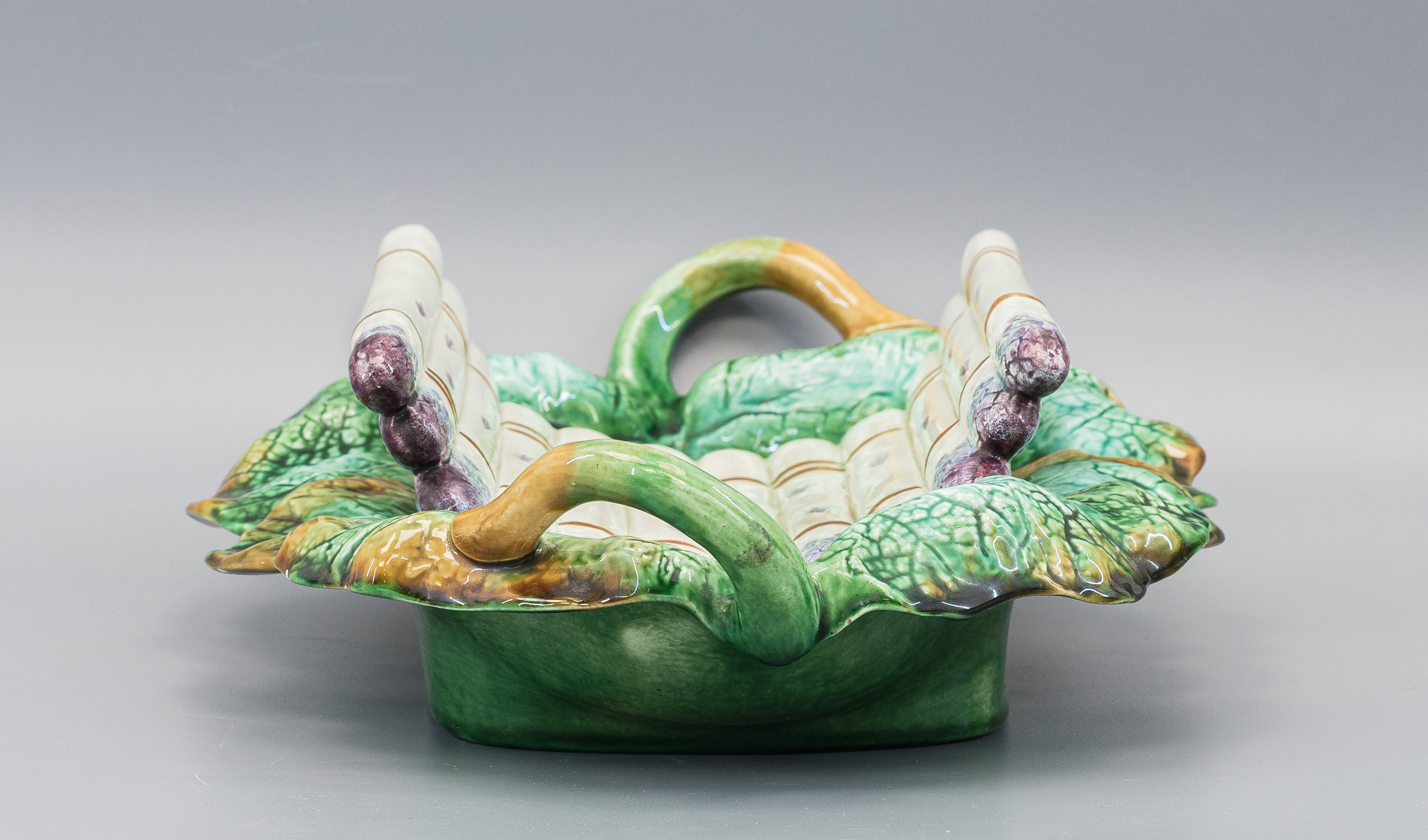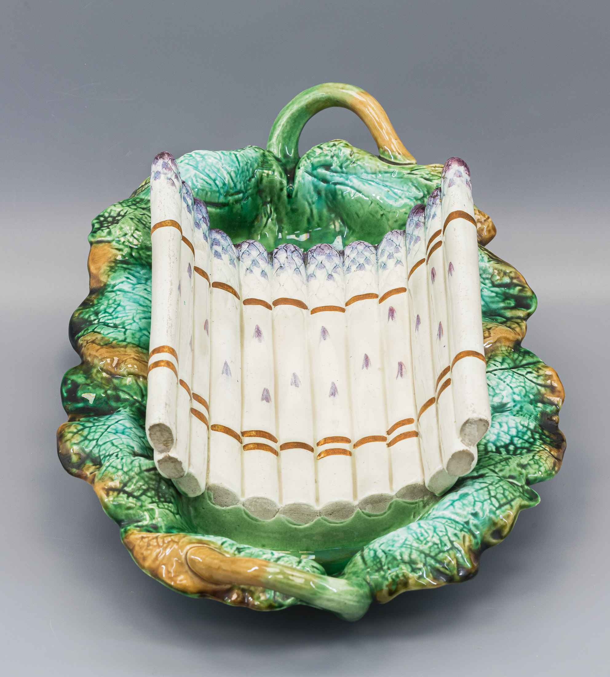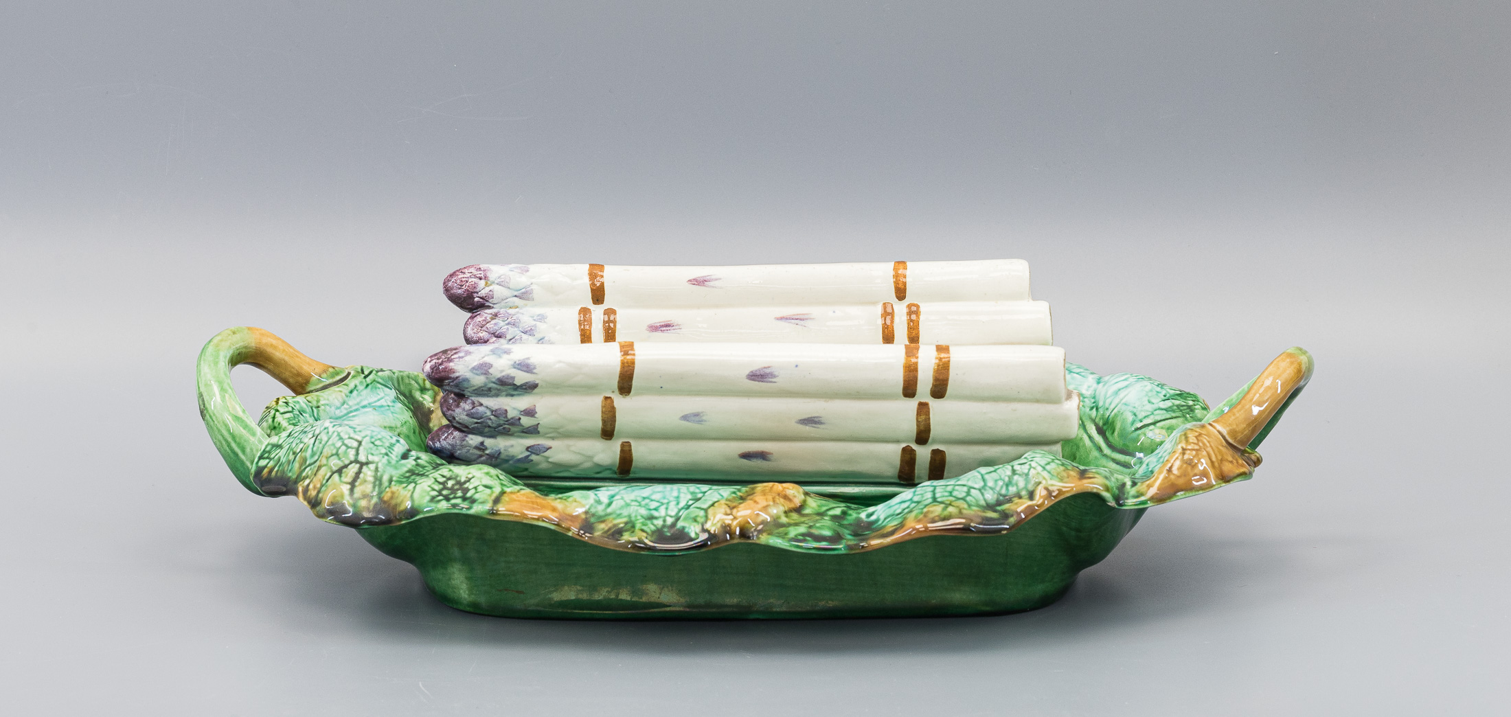 Блюдо представлено в виде срезанных и связанных побегов спаржи, лежащих на двух листьях, черешки которых образуют ручки с двух сторон.