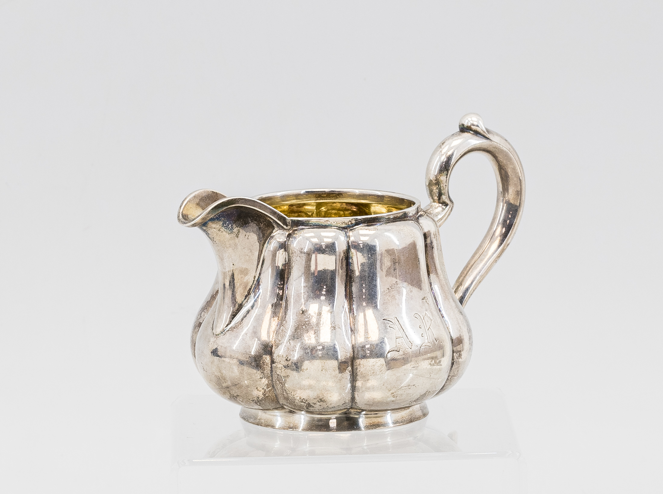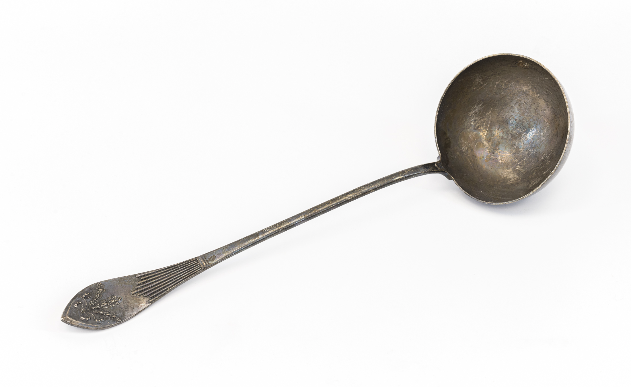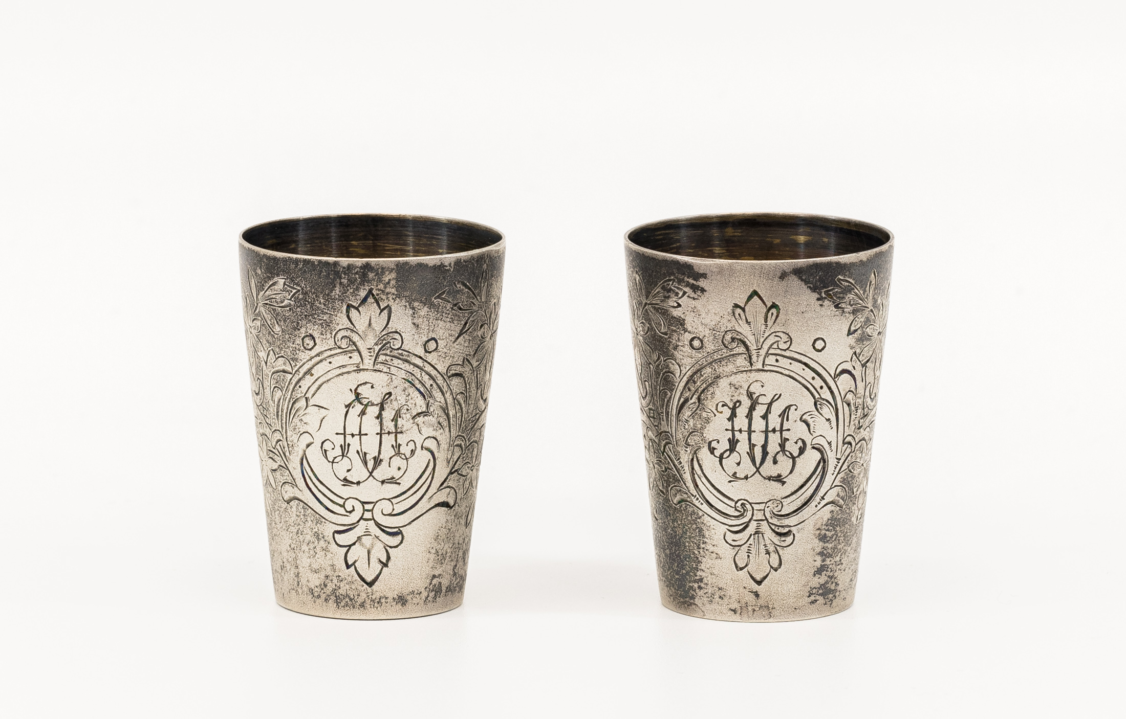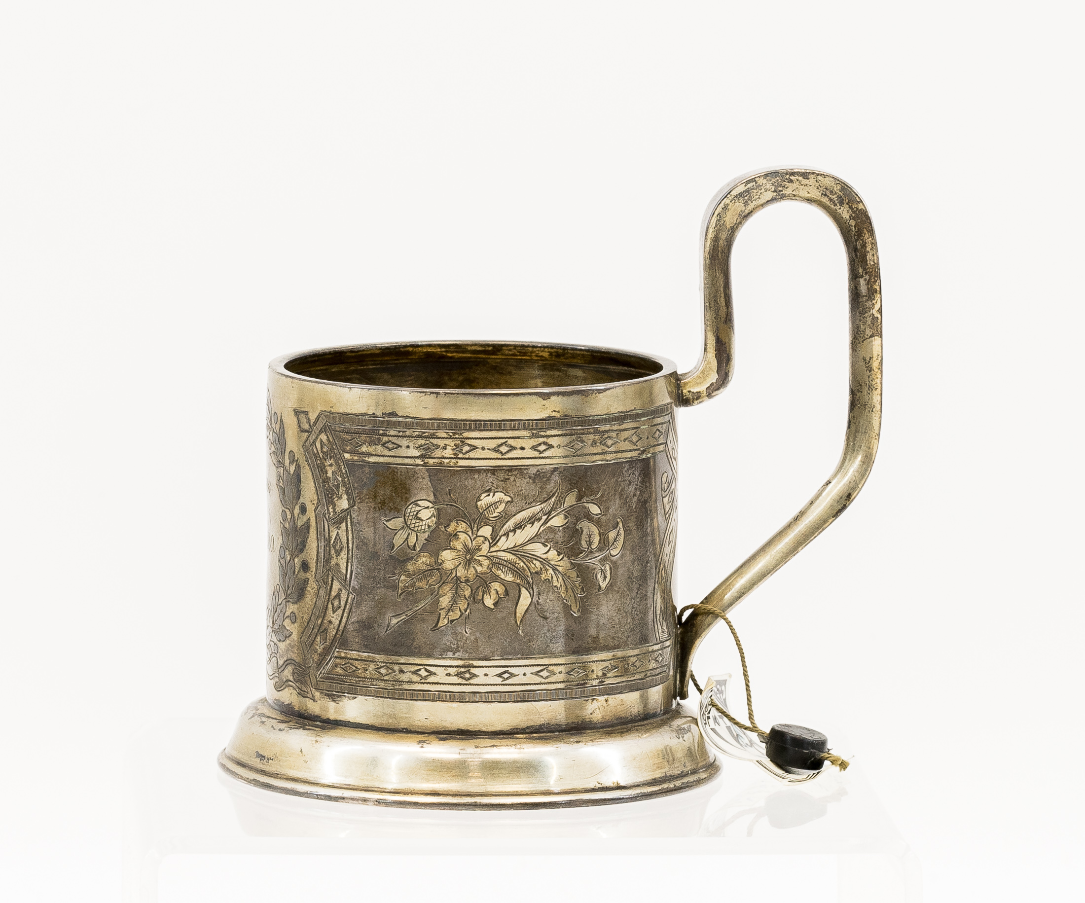Клейма: 1) в круглом щитке герб Петербурга «два якоря и скипетр» (клеймо Пробирной палаты Санкт-Петербурга); 2) «84» в прямоугольном щитке (обозначение пробы); 3) именник «М·К»; 4) именник «Р·М» (Мадсен Петер (?), род. в 1813 г. в Копенгагене, учился в Гельсингфорсе, где в 1893 г. был подмастерьем, переехал в Петербург, где жил и работал в 1850–1861 гг.).