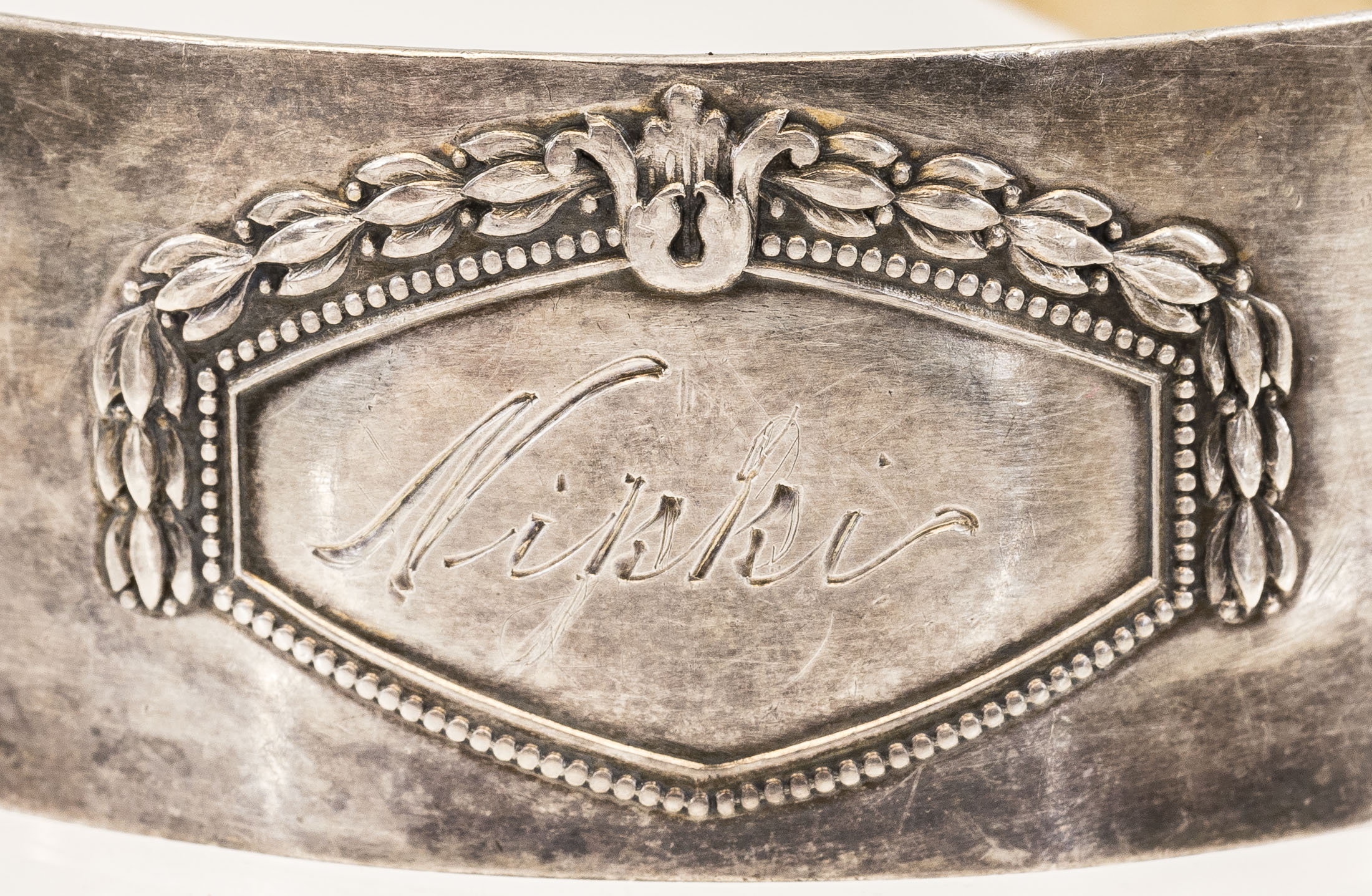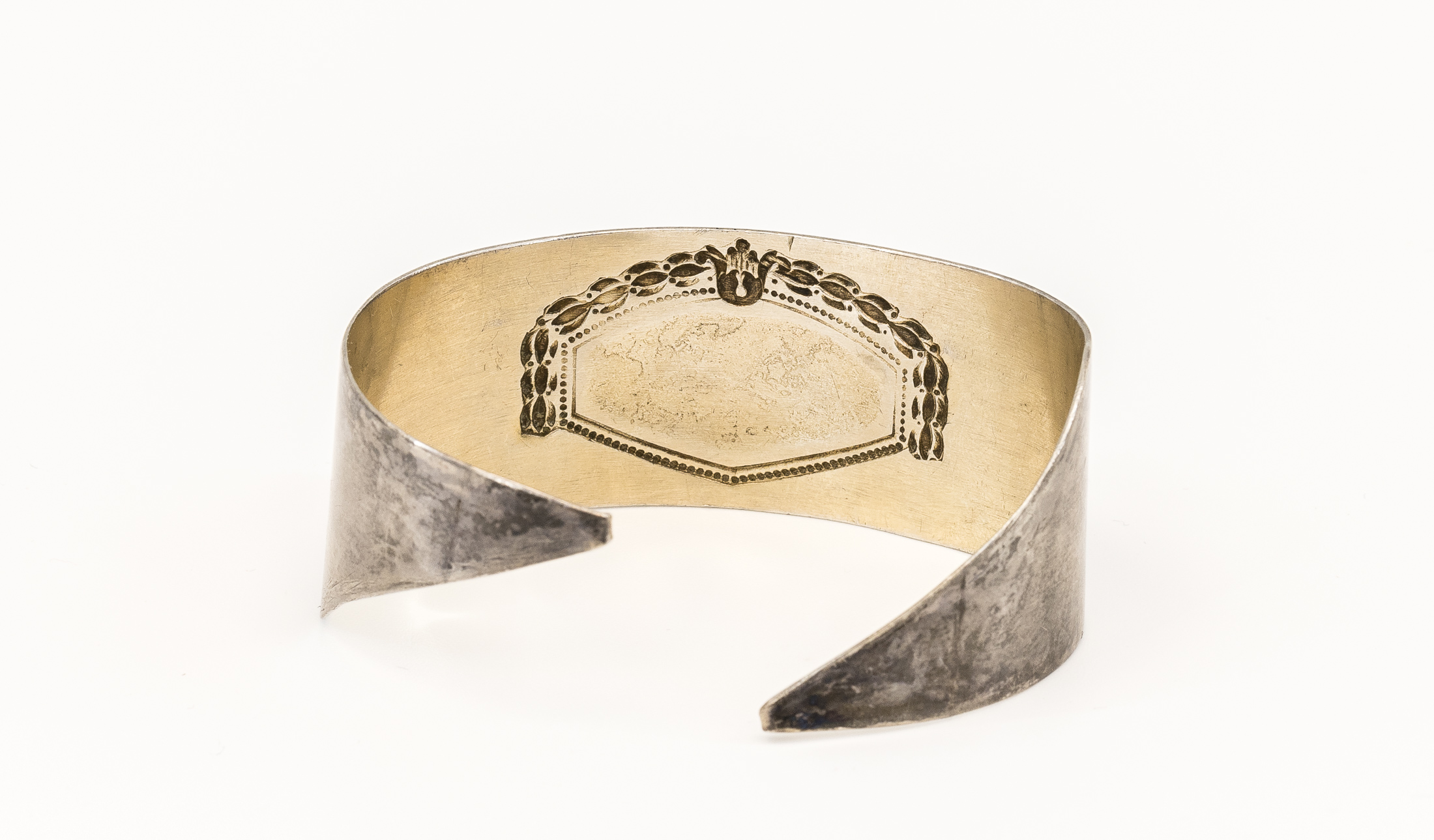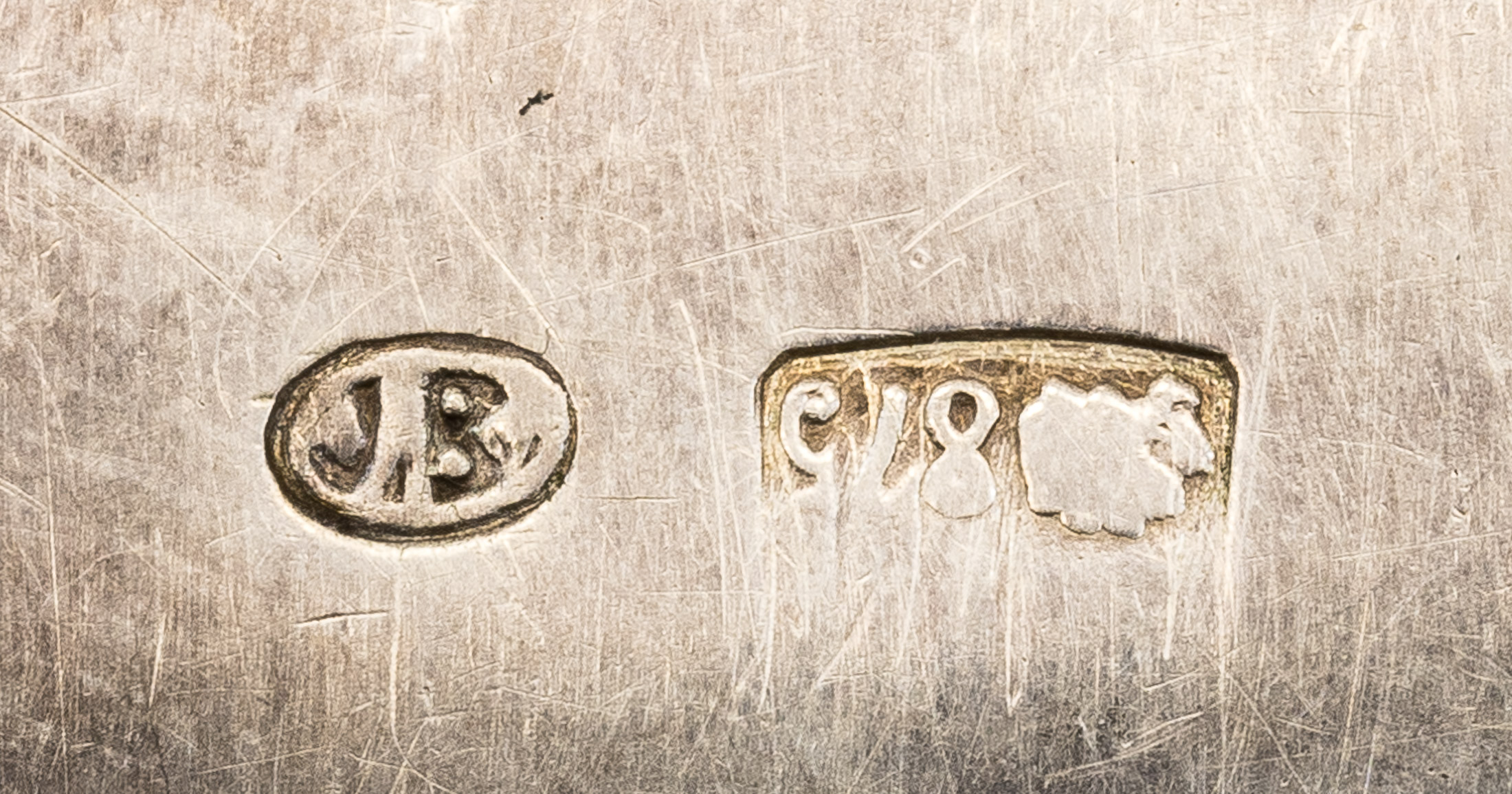 Клейма: 1) 875-й пробы с серпом и молотом на фоне пятиконечной звезды и литерой «р» (?), в щитке в виде прямоугольника с выпуклыми противоположными горизонтальными сторонами (слабо читаемо); 2) в овальном щитке клеймо изготовителя «J.B.»