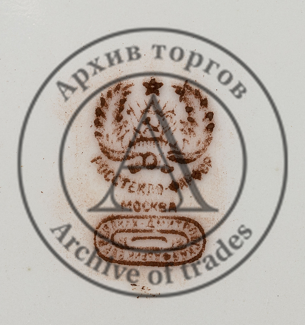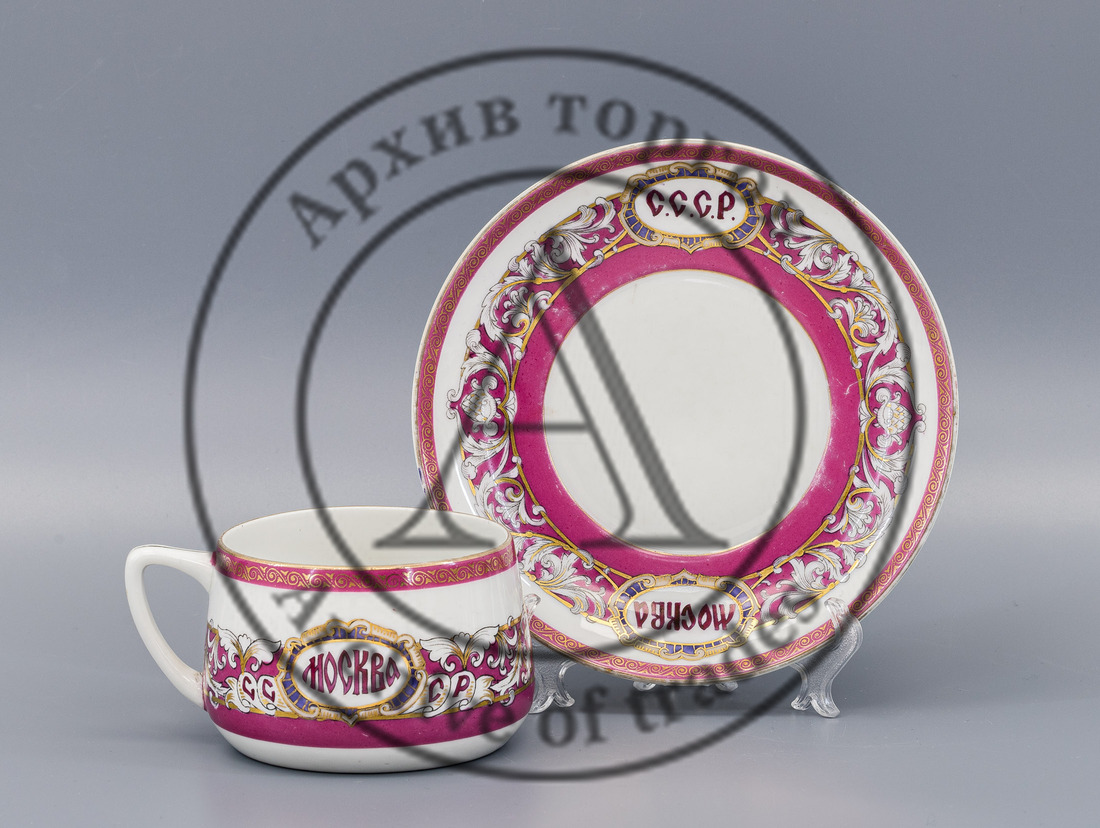 Марки (на чашке и блюдце): печать красным «Росстекло-Фарфор // Москва // Дмитровская фабрик Вербилках» под серпом и молотом в чайнике (для экспортных товаров).