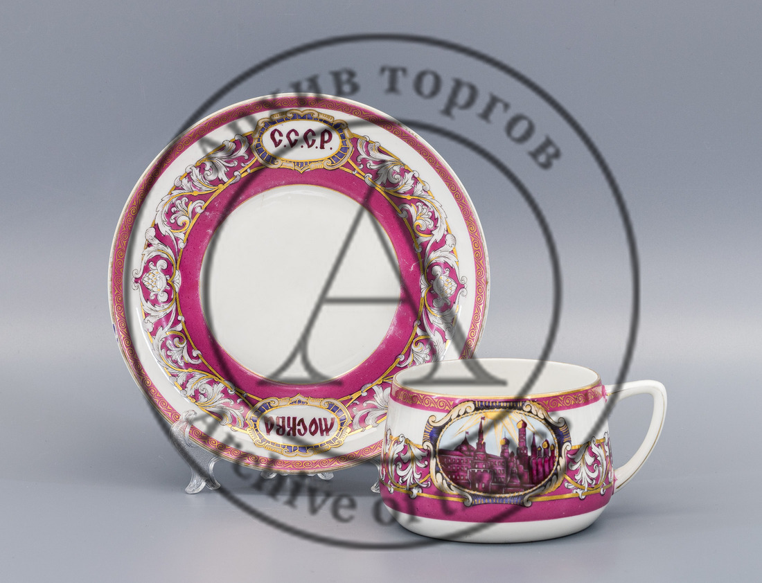 Фарфор, крытье малиновым, хромолитография, роспись, золочение.