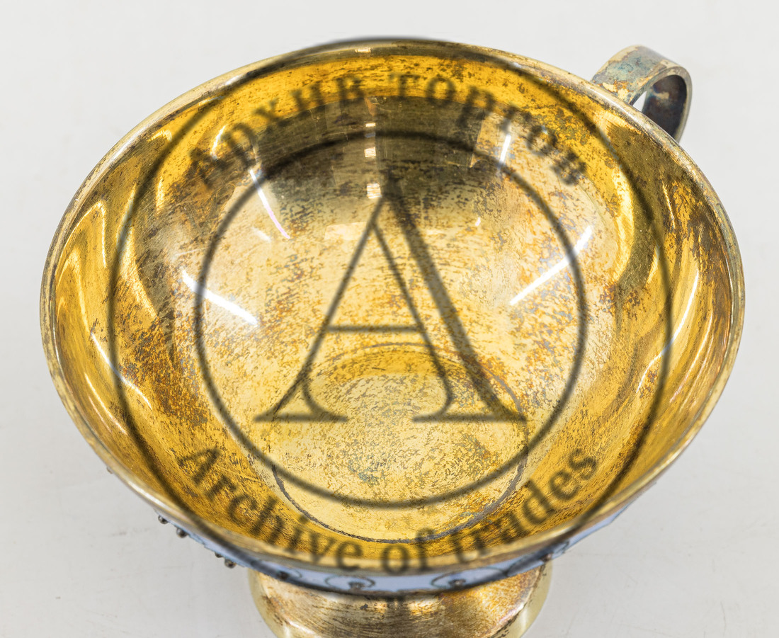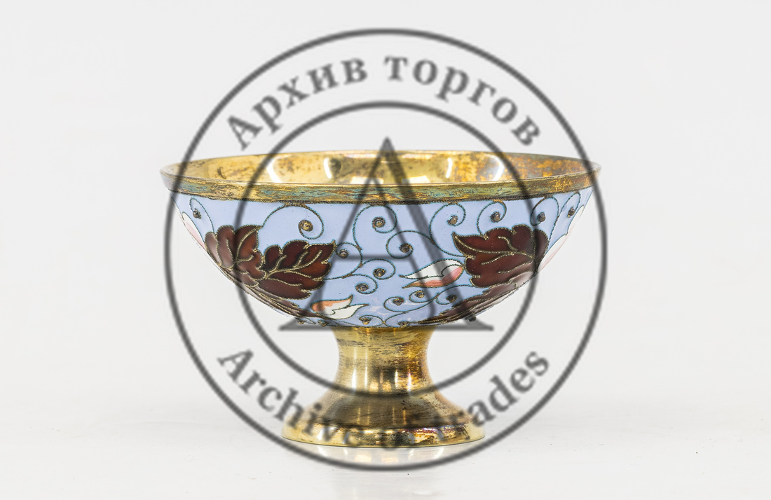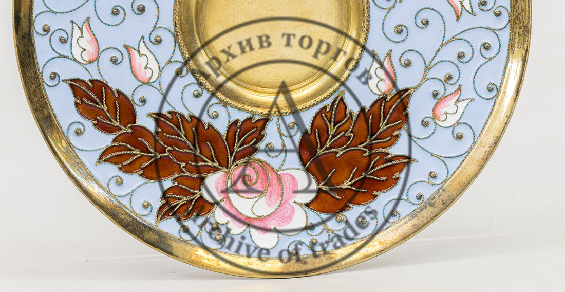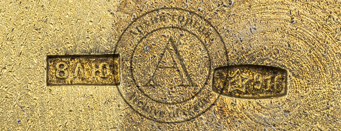 Клейма (на чашке и блюдце): 1) 916-й пробы с серпом и молотом на фоне пятиконечной звезды и литерой «л» (Северо-Западная государственная инспекция, г. Ленинград, 1958-1991 гг.), в щитке в виде прямоугольника с выпуклыми противоположными горизонтальными сторонами; 2) в прямоугольных щитках клейма изготовителя с указанием года производства: «8ЛЮ».