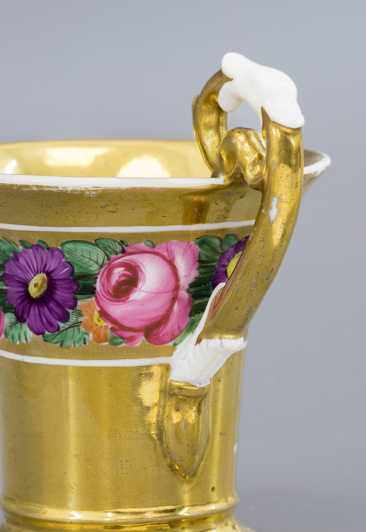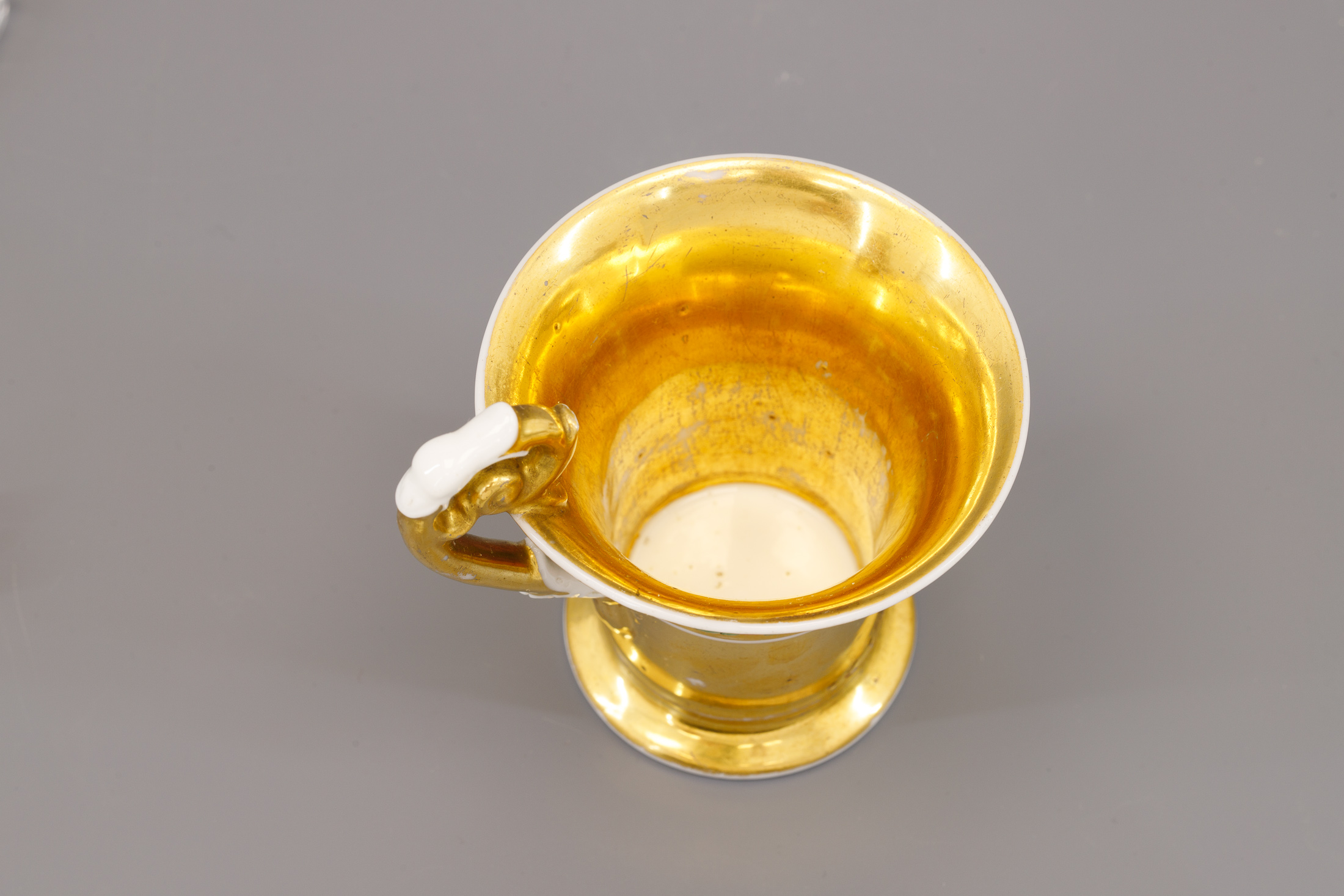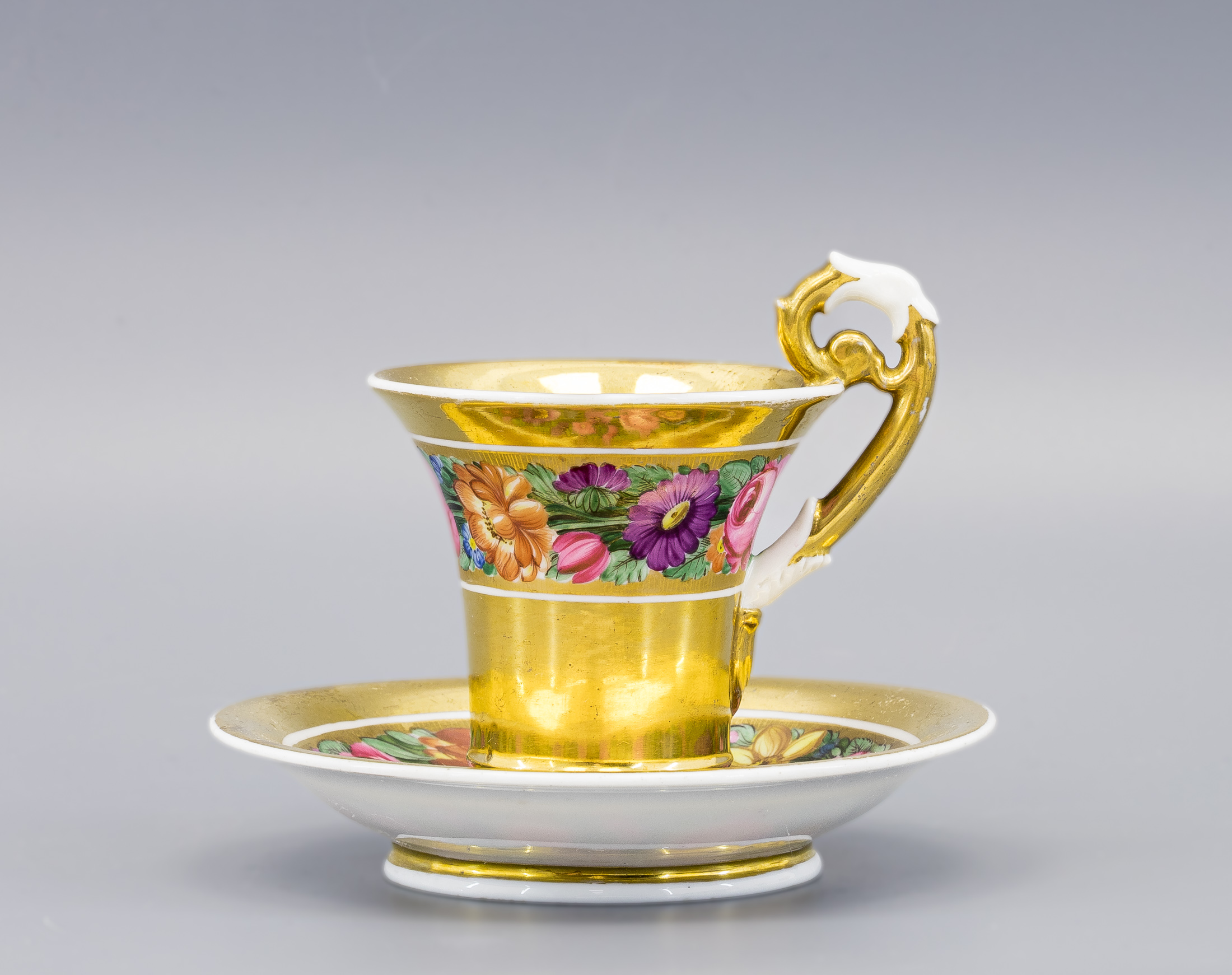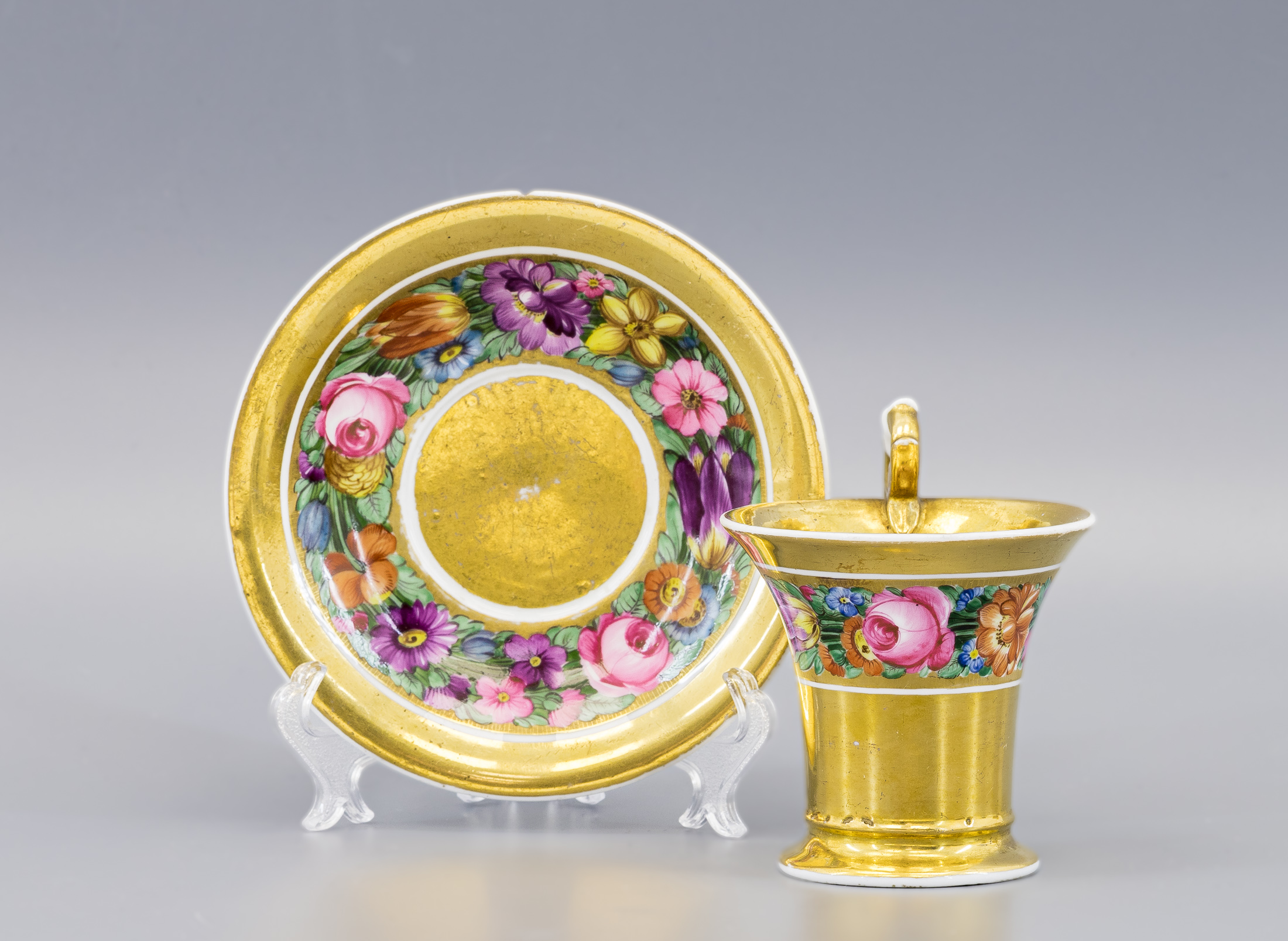 Сохранность хорошая. Легкие потертости золочения, скол и трещина на оборотной стороне блюдца, мушки в тесте.