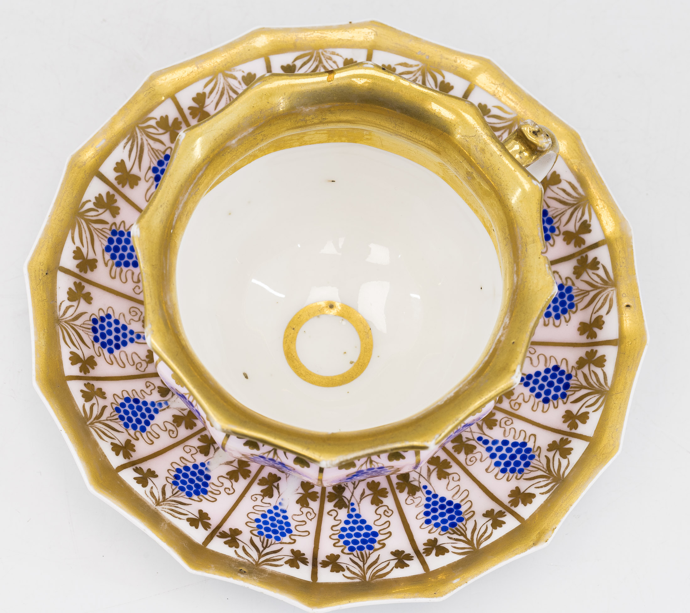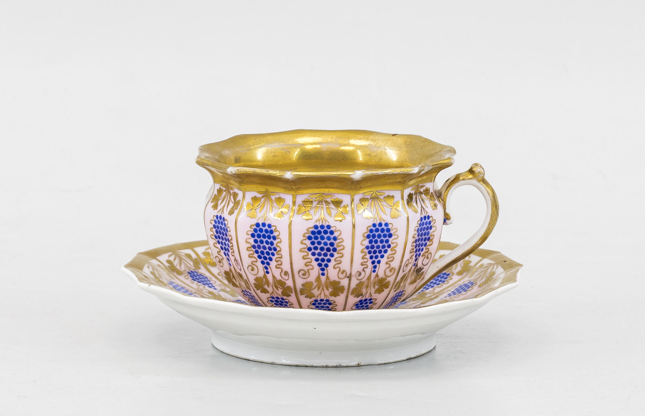 Фарфор, крытье розовым, роспись, отводка золотом и золочение по трафарету.