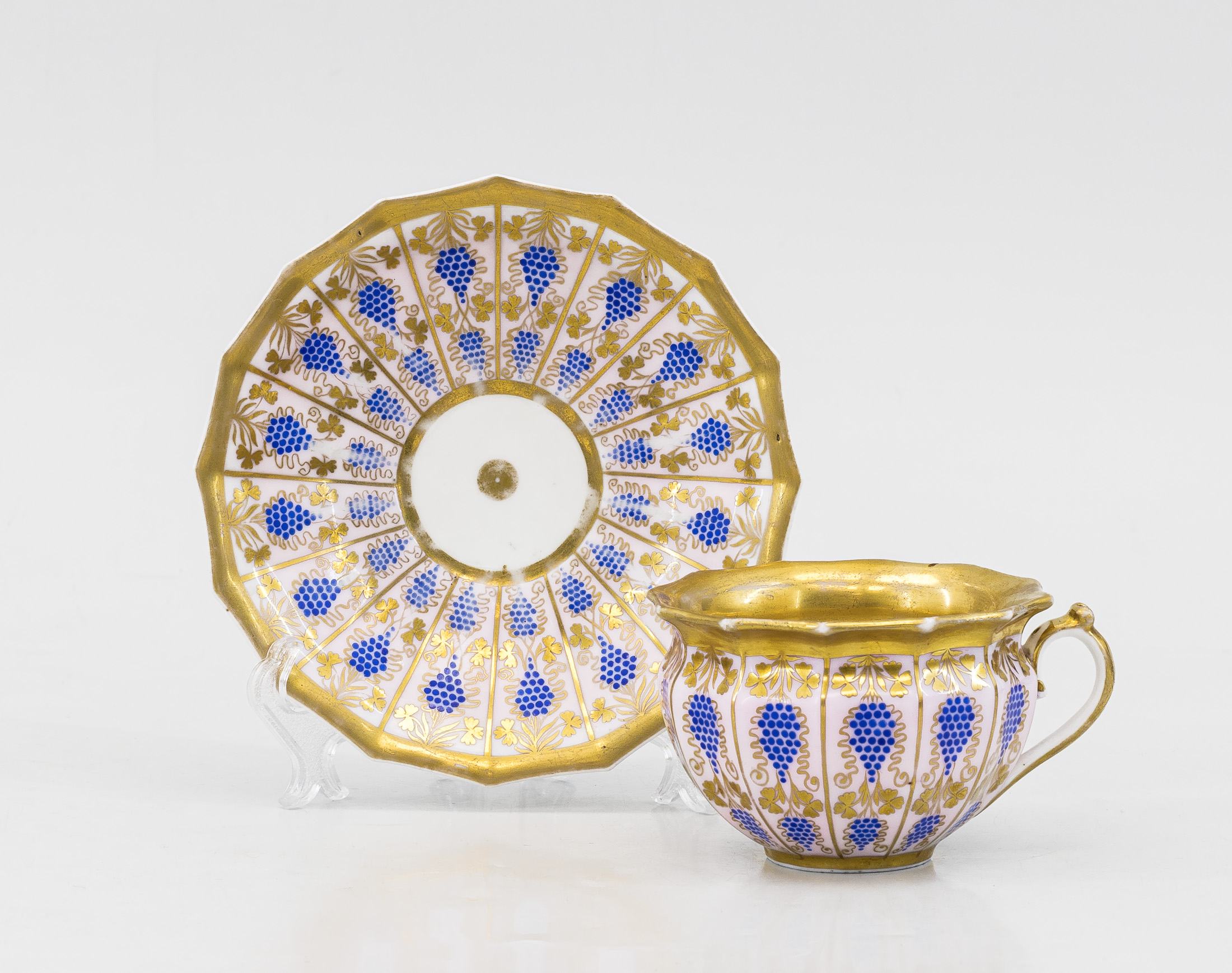 Сохранность: потертости золочения; скол по краю чашки, ниже скола две пересекающиеся сквозные трещины; мушки в тесте.
