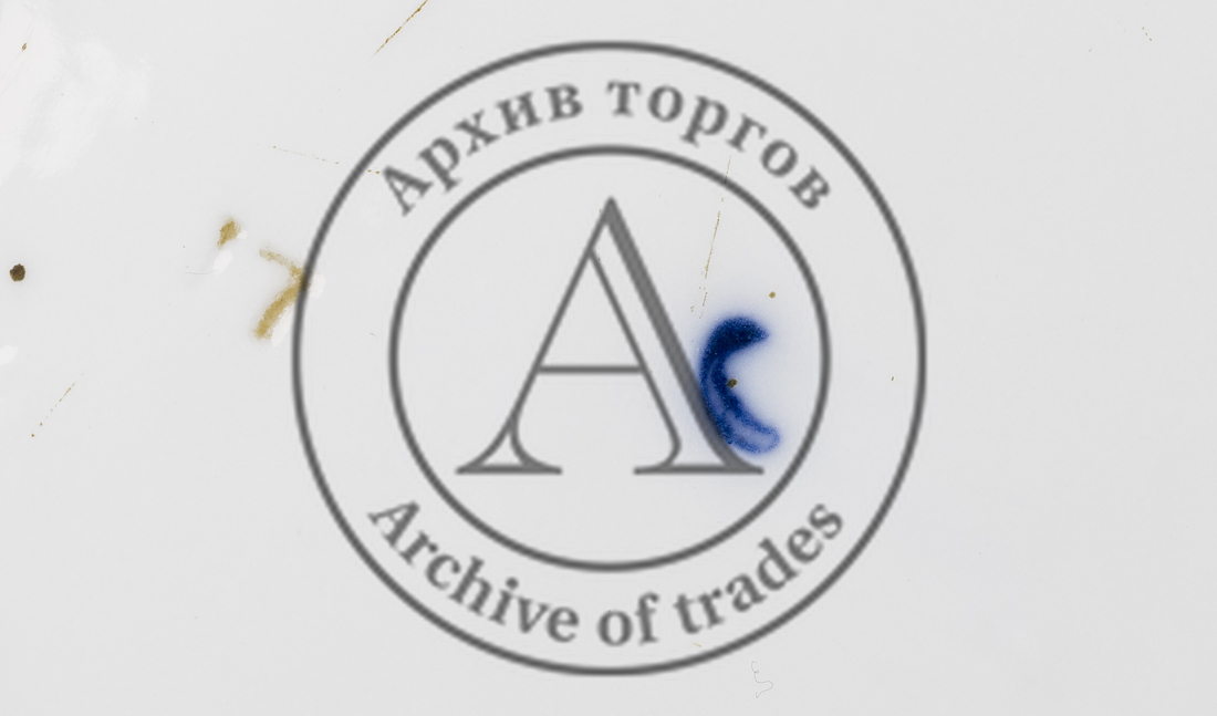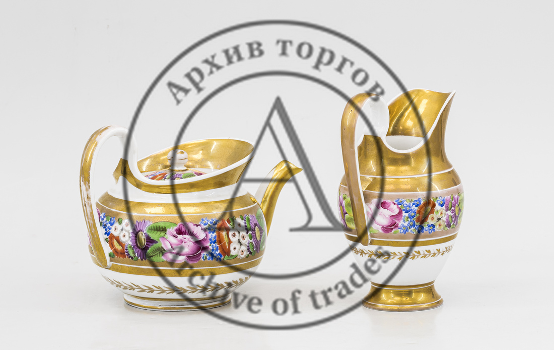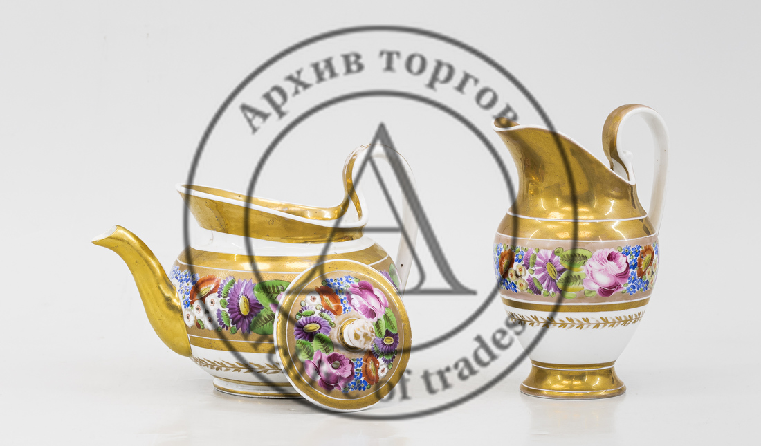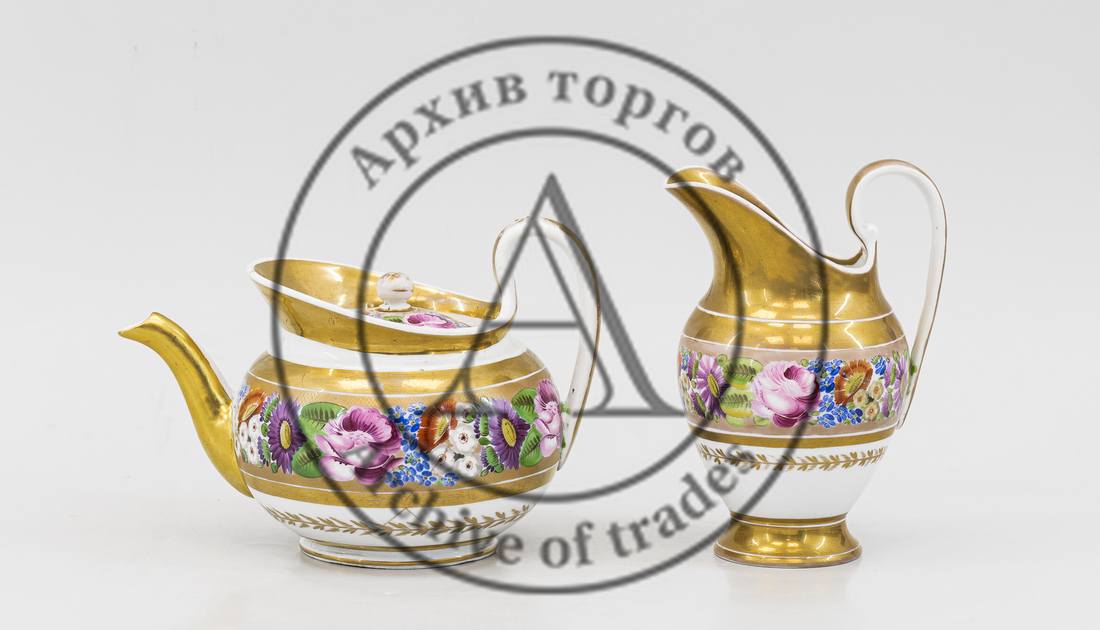 Сохранность: потертости золочения и легкие загрязнения; чайник: скол на внутренней стороне ободка и реставрация носика, две «паутинки» и сквозная трещина на стенке.