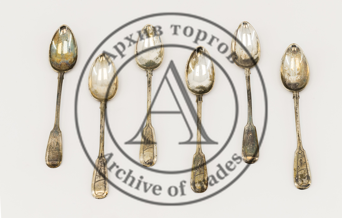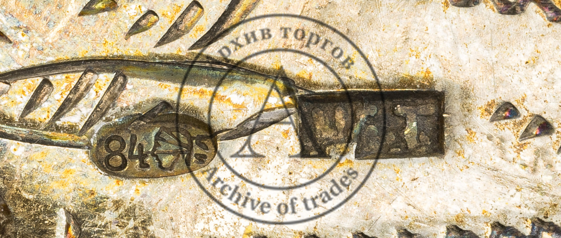Клейма: 1) 84-я проба, «женская голова в кокошнике, обращенная влево» и инициалы «ИЛ» в овальном щитке (клеймо Московского пробирного управления, с инициалами пробирного инспектора Ивана Лебедкина 1898-1908 гг.); 2) именник «Н.I.Т.» или «Н.Т.Г.» (?) в прямоугольном щитке (слабо читаемо).