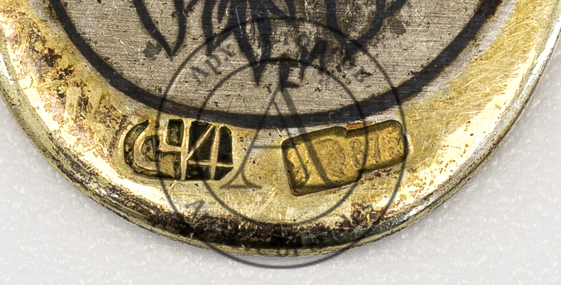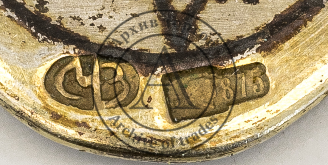 Клейма: 1) литера «Δ» (дельта), голова рабочего, обращенная вправо, с молотком и «875» в щитке в форме лопатки; 2-3) «СЧ3» (на трёх ложках), «СЧ4» (на одной ложке).