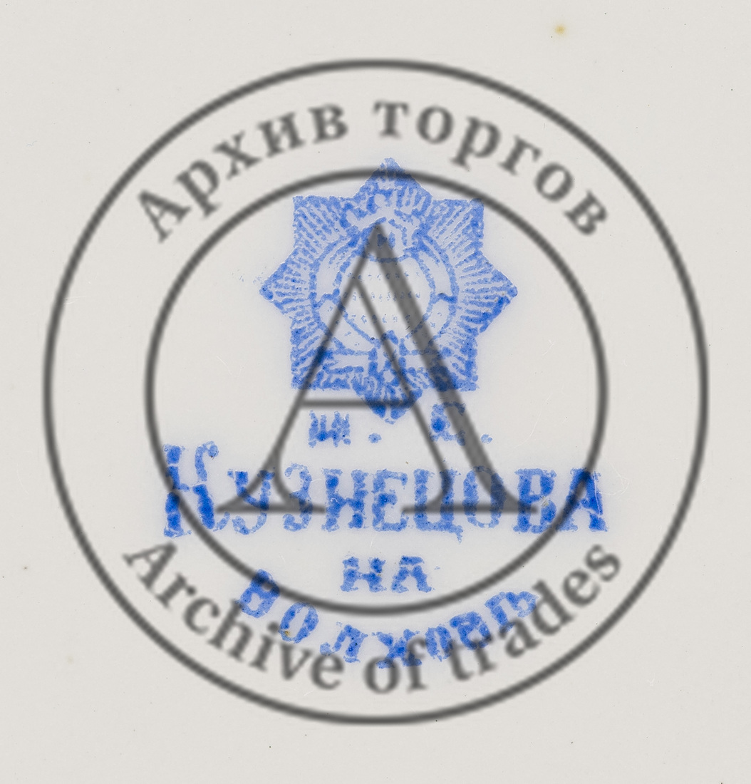 Марка: 1) под орденом марка «М.С. Кузнецова на Волховѣ» (надглазурная печать синим).