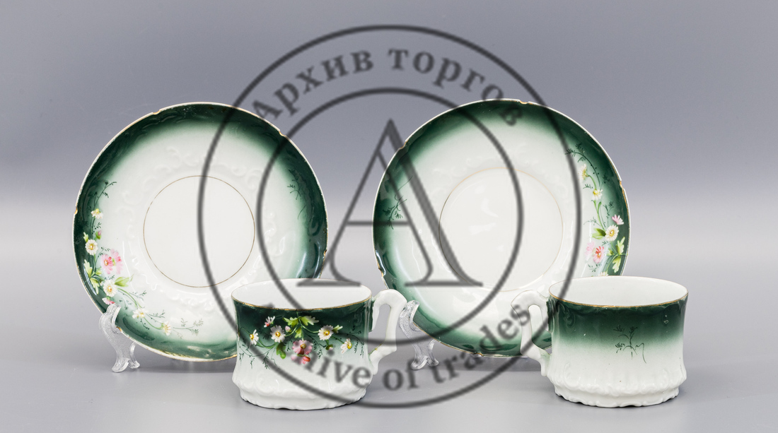 5) Две чайные пары. Размеры. Чашка: высота 5,5 см, диаметр верха 7,5 см, диаметр основания 6,6 см, максимальная ширина 9,5 см. Блюдце: высота 2,4 см, диаметр борта 14 см, диаметр основания 8,8 см. Сохранность: две волосяные сквозные трещины на одной чашке.