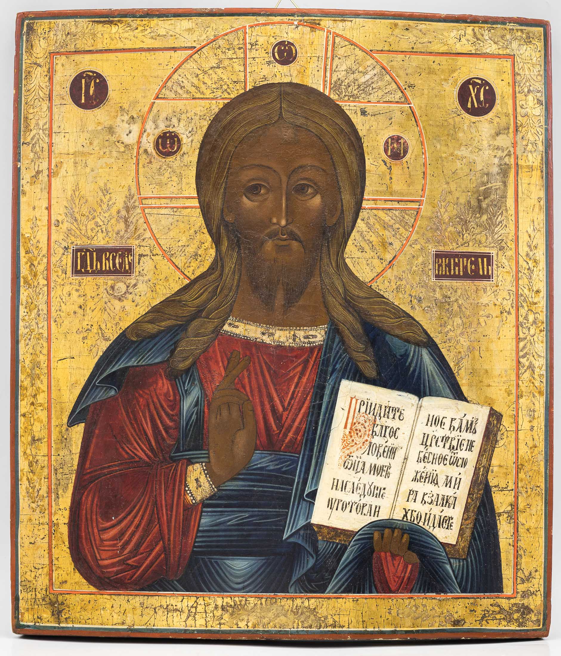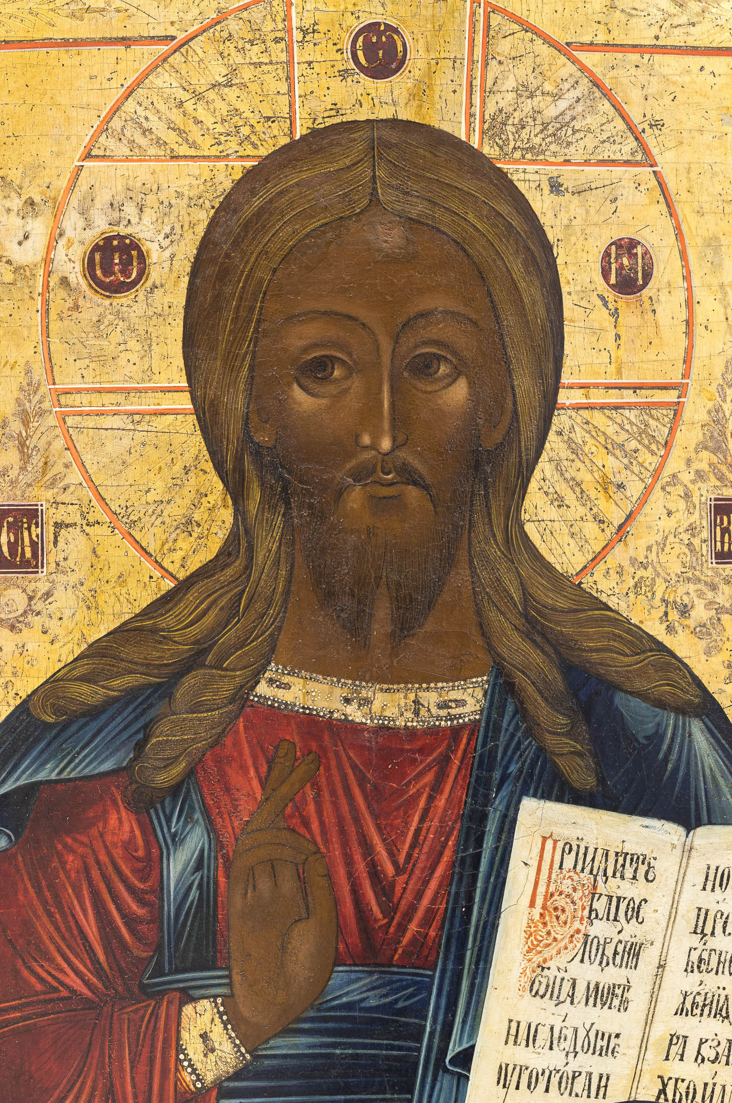 У Христа текст из Евангелия от Матфея (Мф. 25:34–35): «Приидите, благословенные Отца Моего, наследуйте уготованное вам Царствие Небесное от сложения мира. Ибо алкал Я, и вы дали Мне есть».