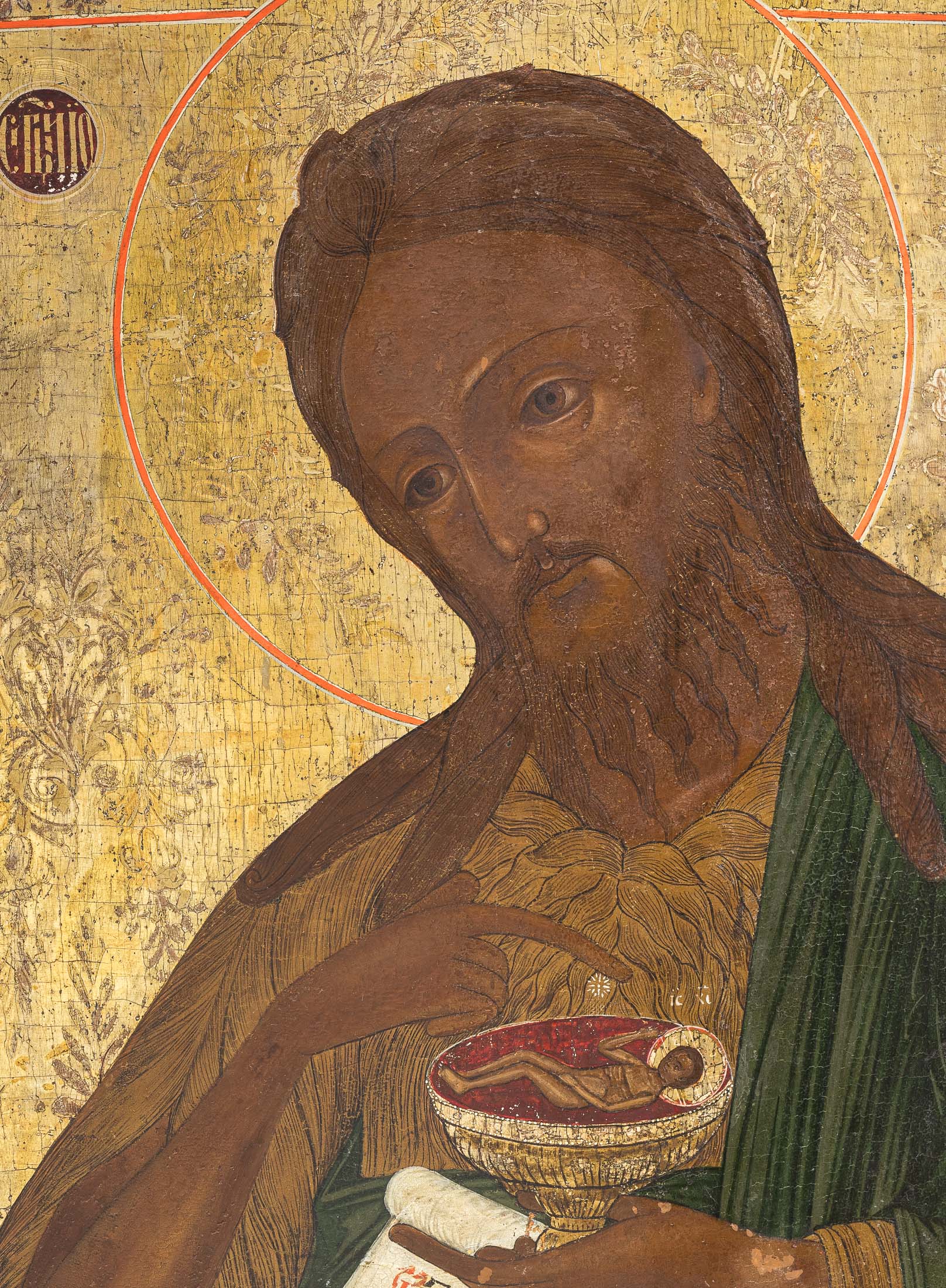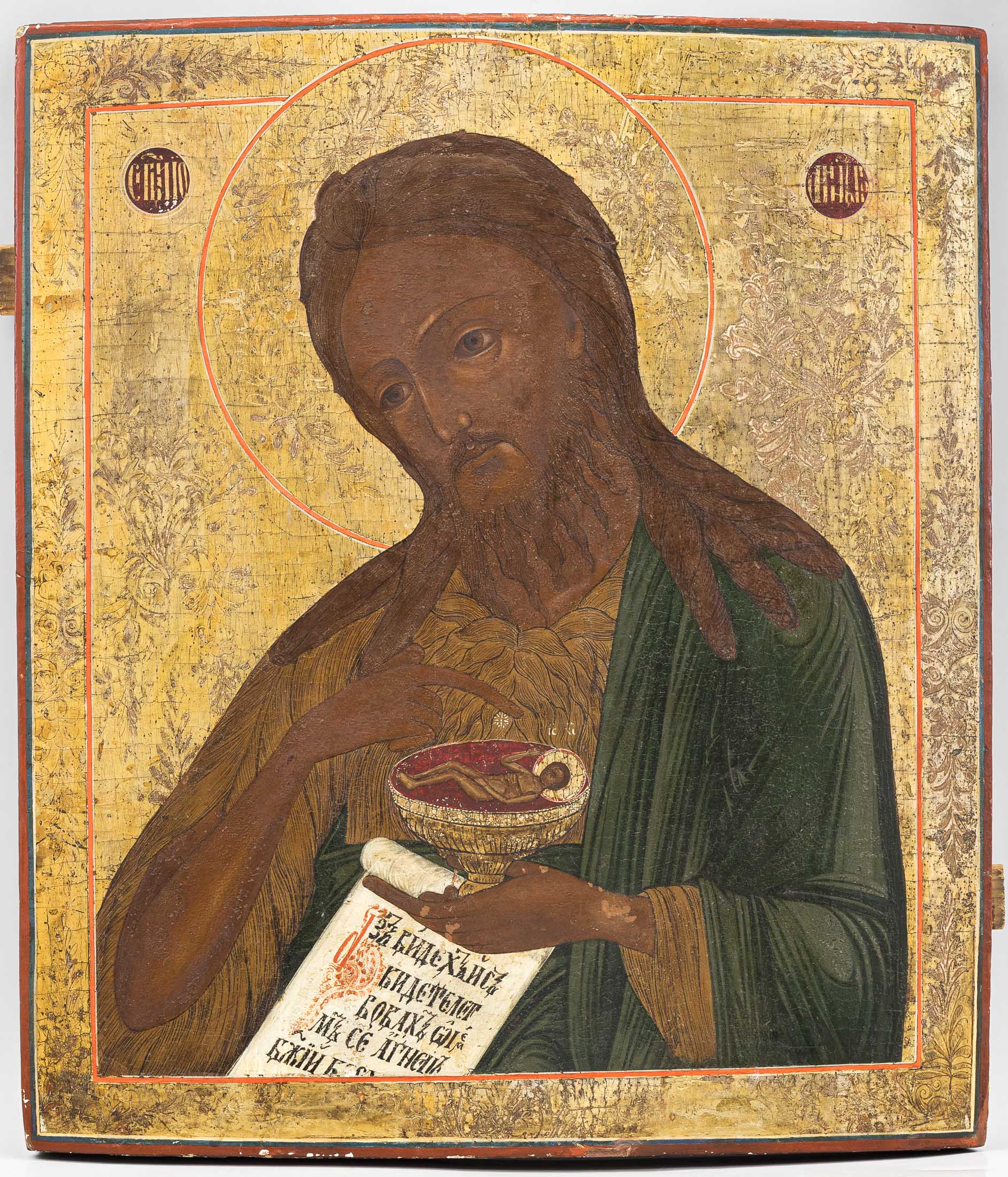 У Иоанна Предтечи цитата из Евангелия от Иоанна (Ин. 1:34; 1:29): «Се видех и свидетельствовах глаголя: се Агнец Божий, [вземляй грехи мира]» [И я видел и засвидетельствовал, что вот Агнец Божий].