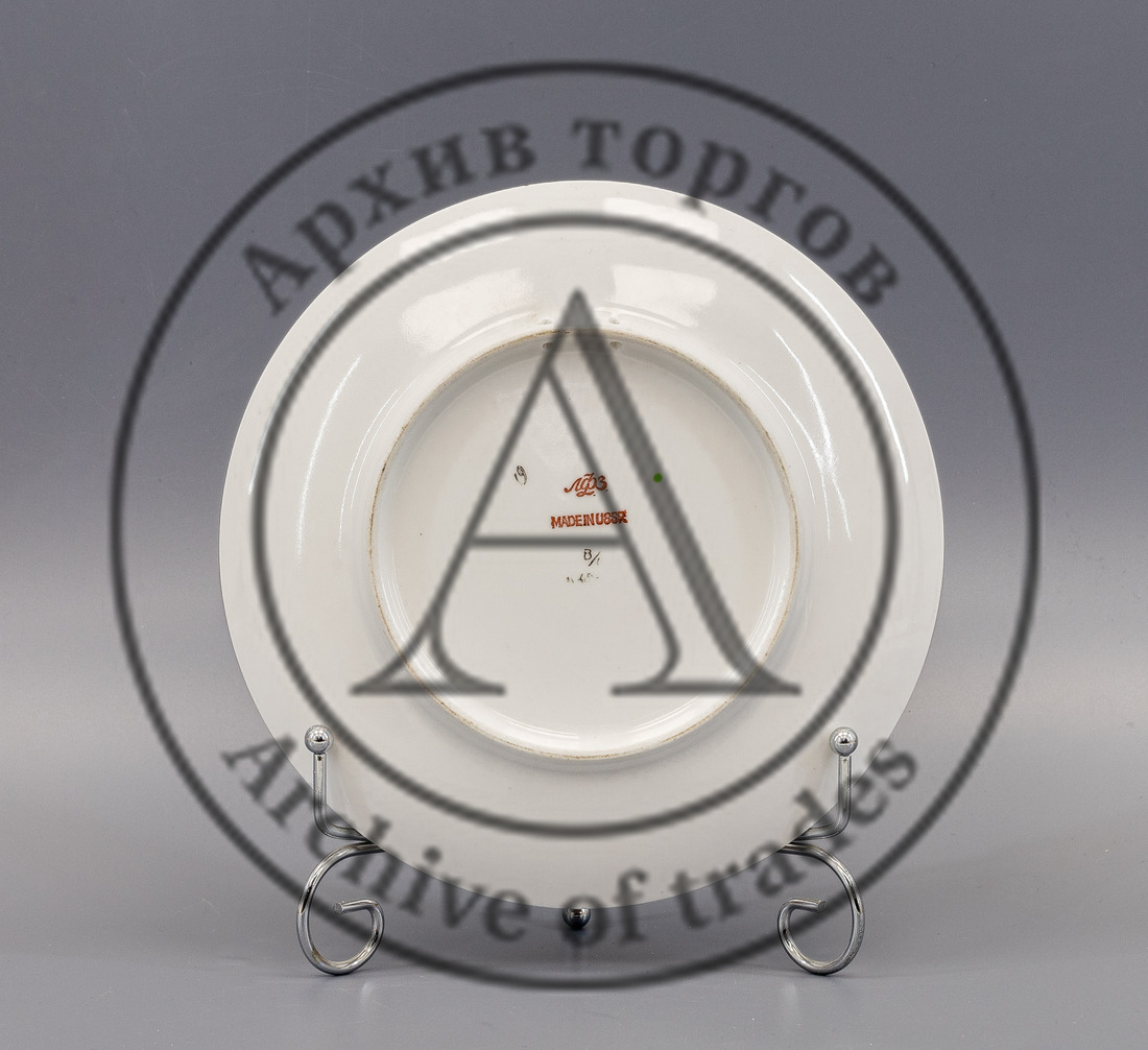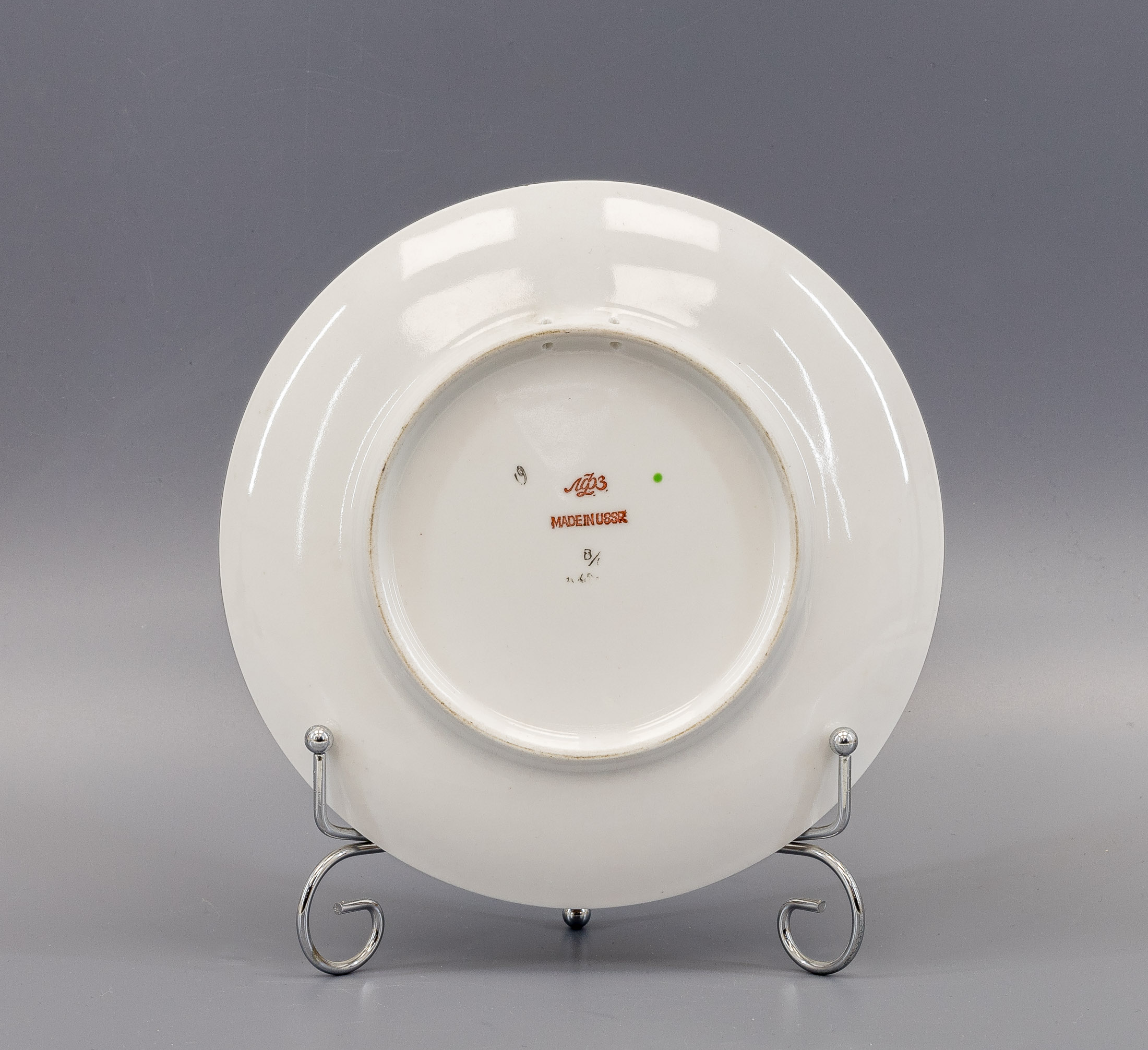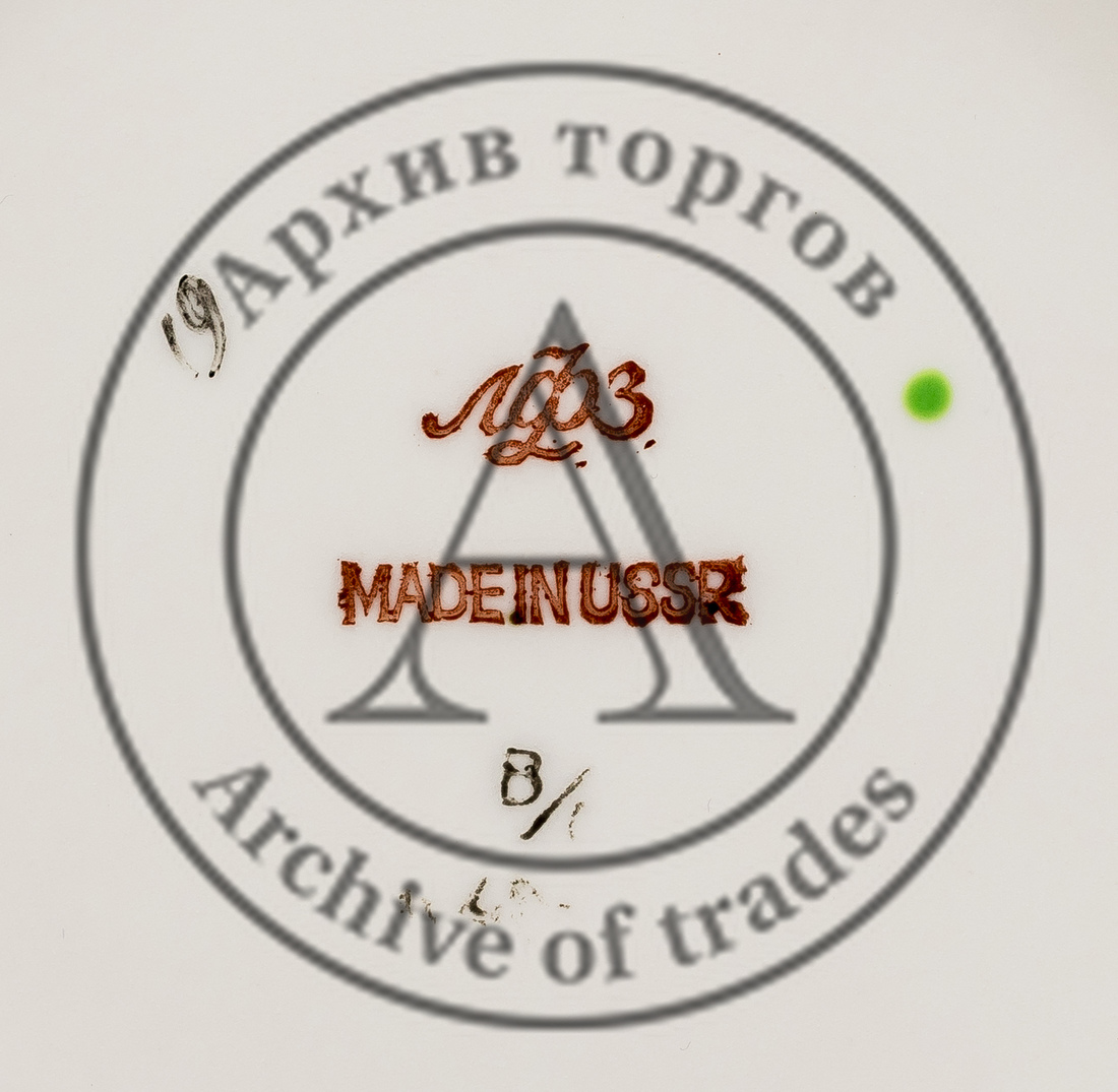 Марки: 1) «ЛФЗ MADE IN USSR» (печать красным), 2) «В/С» (чёрным, слабо читаемо); 3) «19» чёрным от руки; 4) зелёная точка подглазурно.