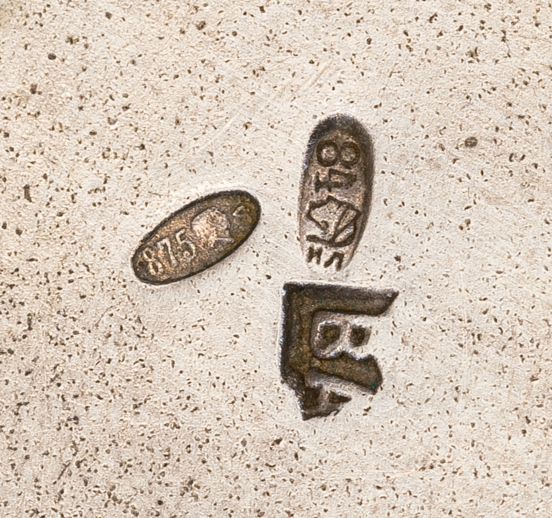 клеймо перепробации советского периода: 3) 875-й пробы и «голова рабочего, обращенная вправо, с молотом» в овальном щитке (перепробация 1927-1955 гг.).