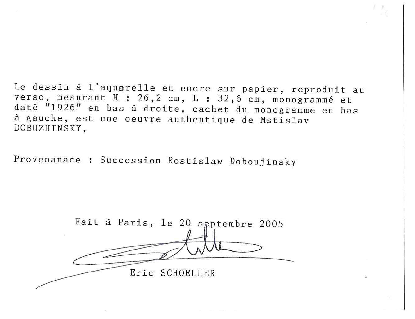 Экспертиза-консультация Эрика Шоллера (на фр. яз.). Работа происходит из семьи М. Добужинского