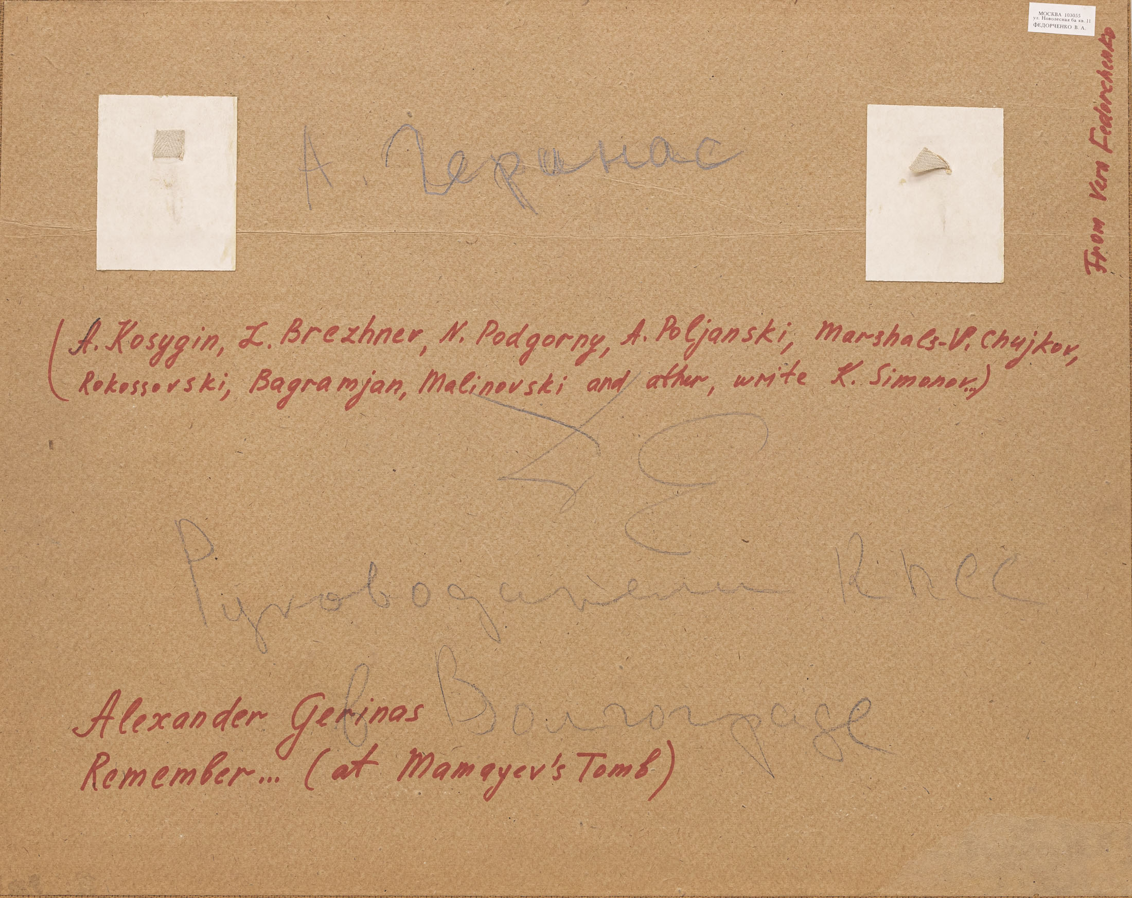 На фотографии изображены: А.Н. Косыгин, Л.И. Брежнев, Н.В. Подгорный, Д.С. Полянский, В.И. Чуйков, К.К. Рокоссовский, И.Х. Баграмян, Р.Я. Малиновский, К.М. Симонов и др.