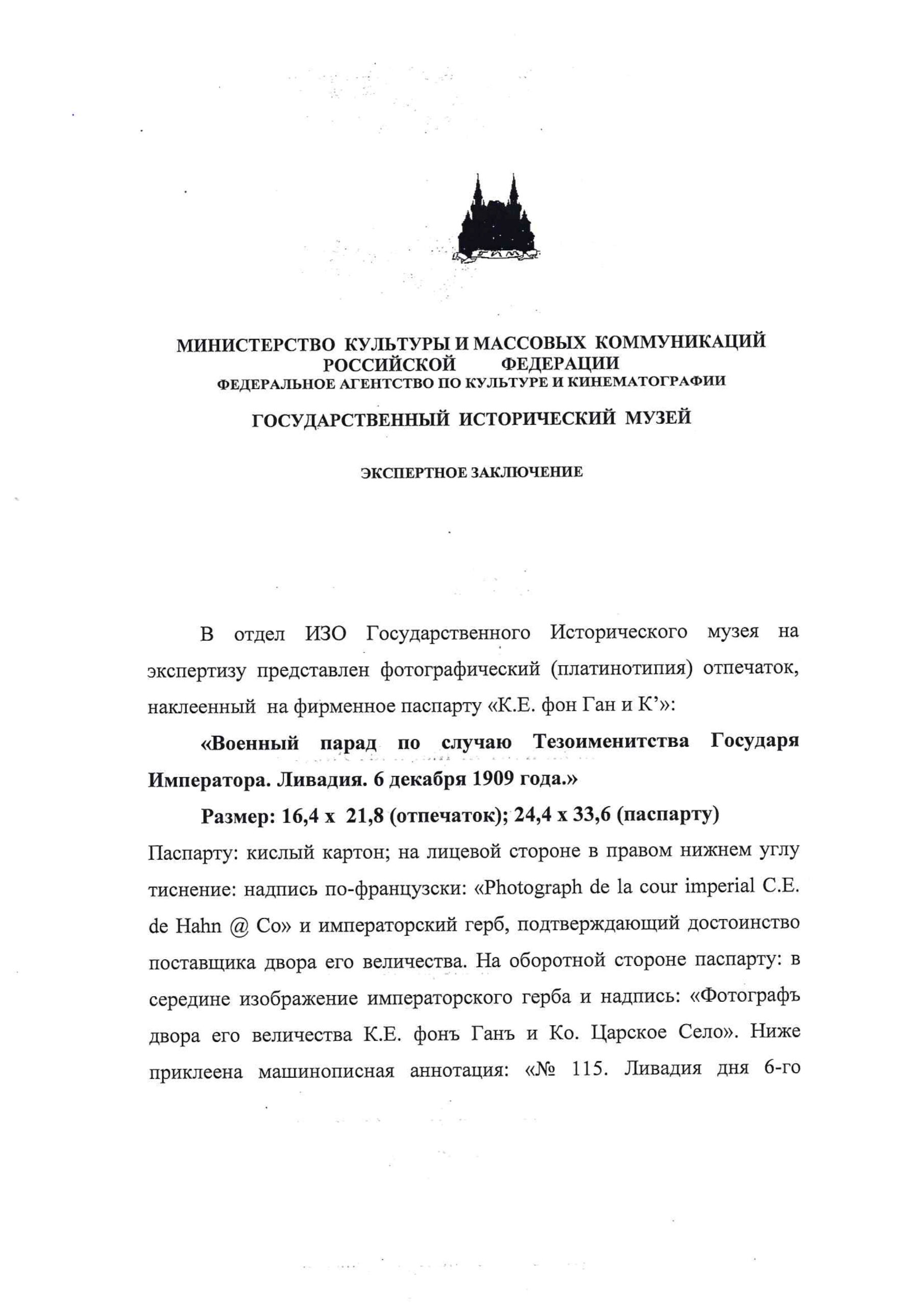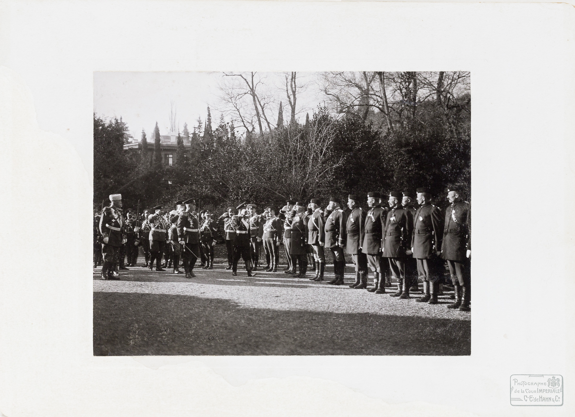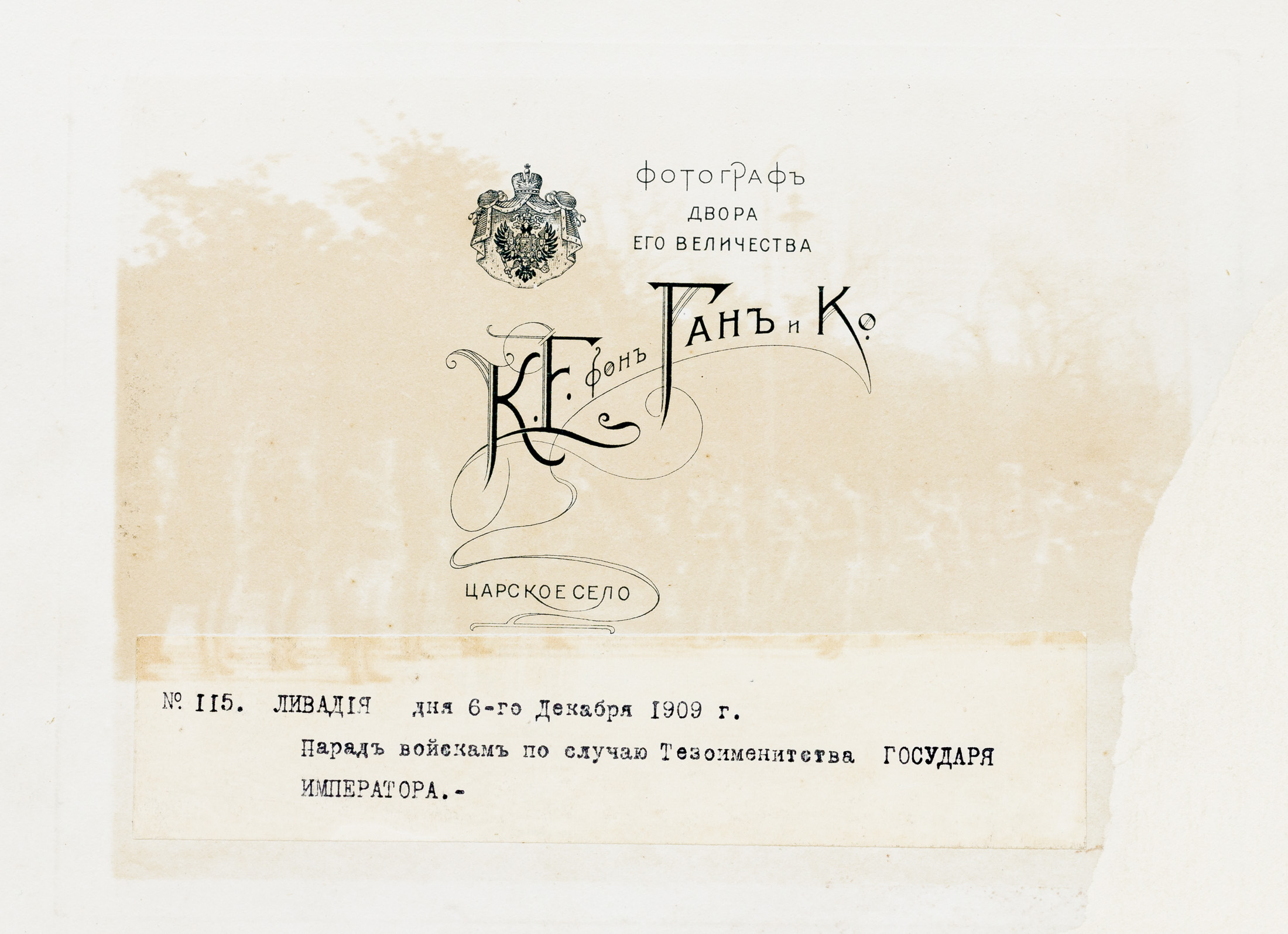 На лицевой стороне паспарту в правом нижнем углу тиснение «Photographe de la Cour Imperiale C.E. de Hann & Co». На обороте паспарту – императорский герб и надпись «Фотограф двора Его Величества К.Е. фонъ Ганъ и Ко. Царское Село». Ниже – наклейка с машинописным текстом: «№115. ЛИВАДIЯ дня 6-го Декабря 1909 г. Парадъ войскамъ по случаю Тезоименитства ГОСУДАРЯ ИМПЕРАТОРА».