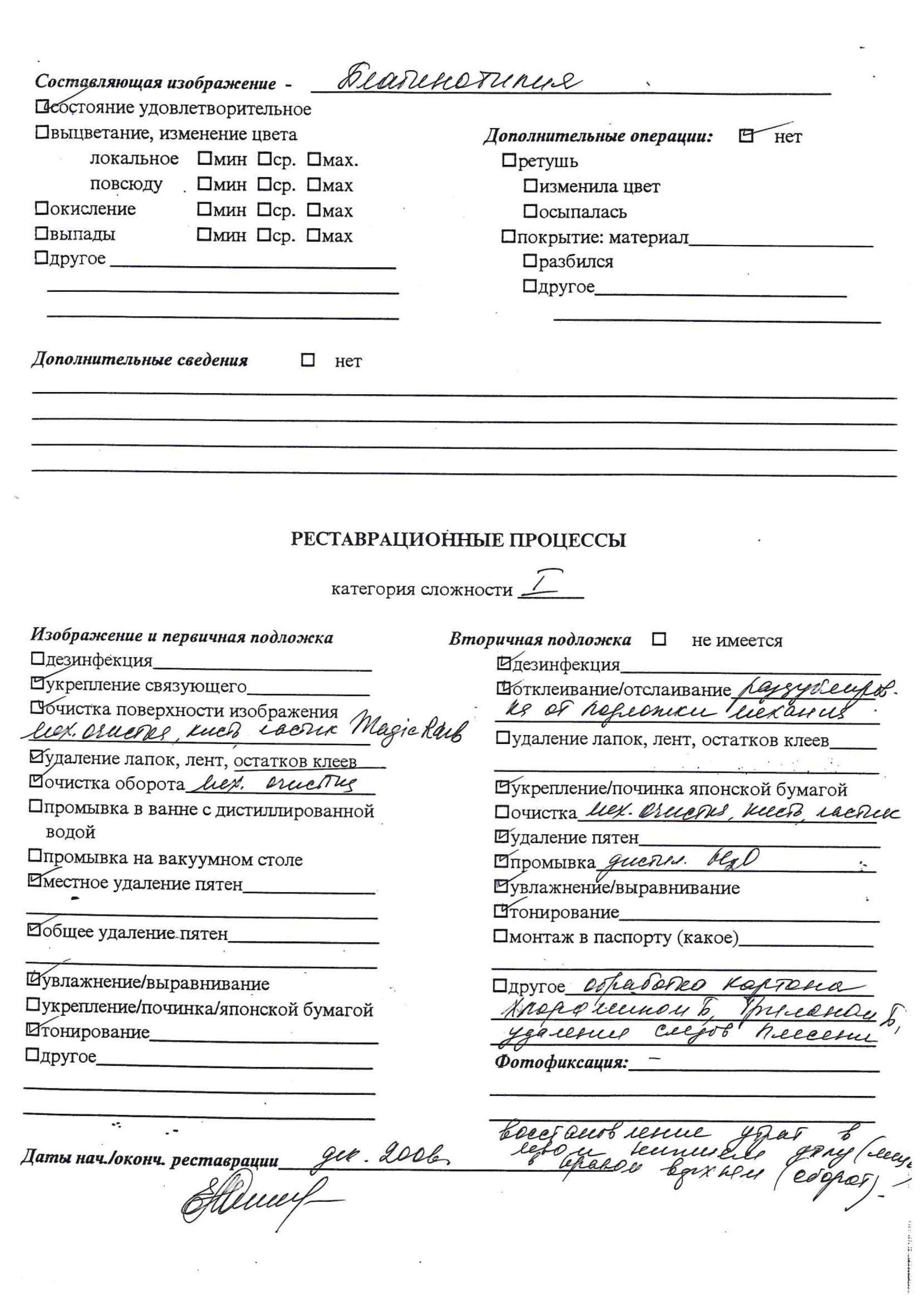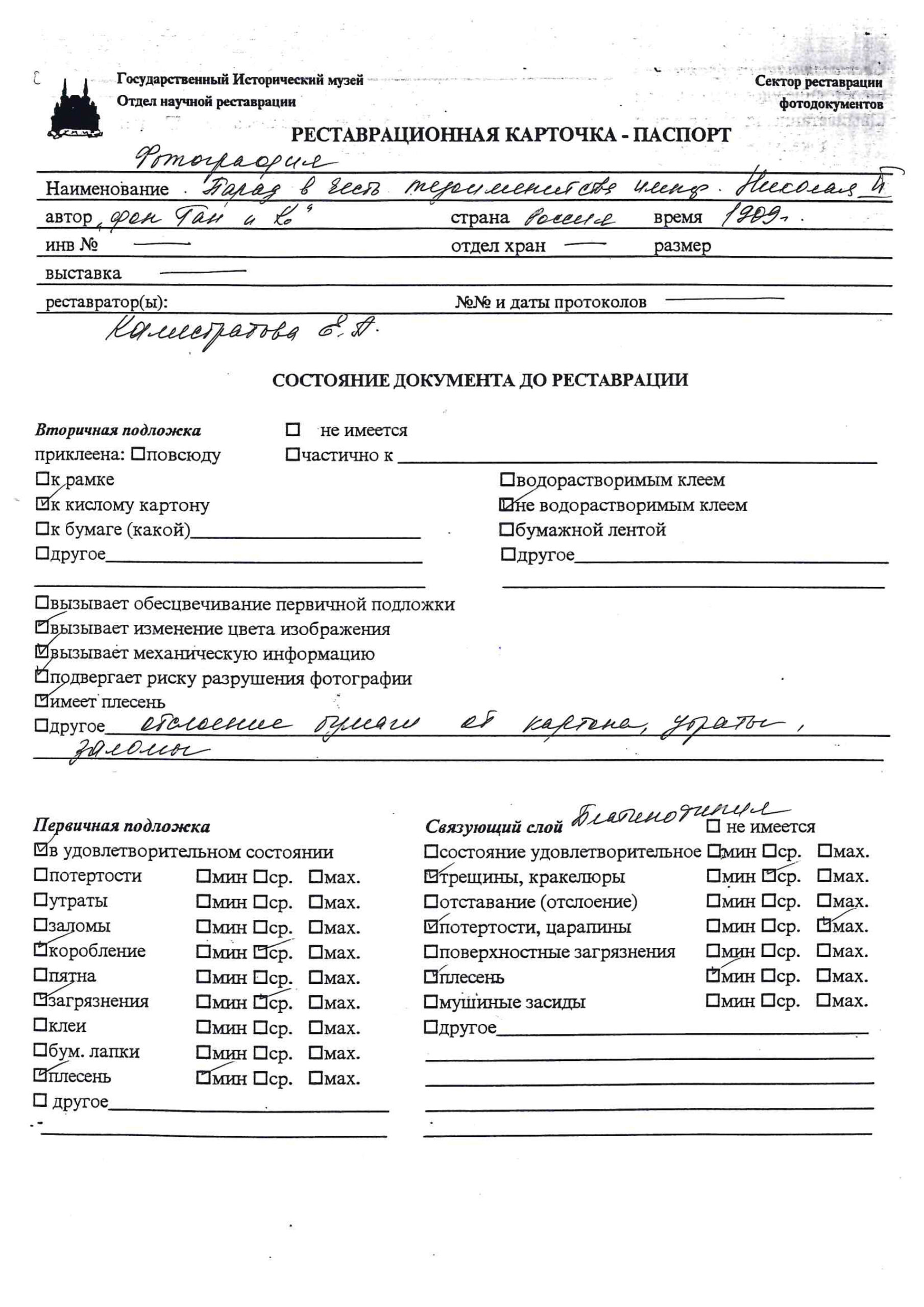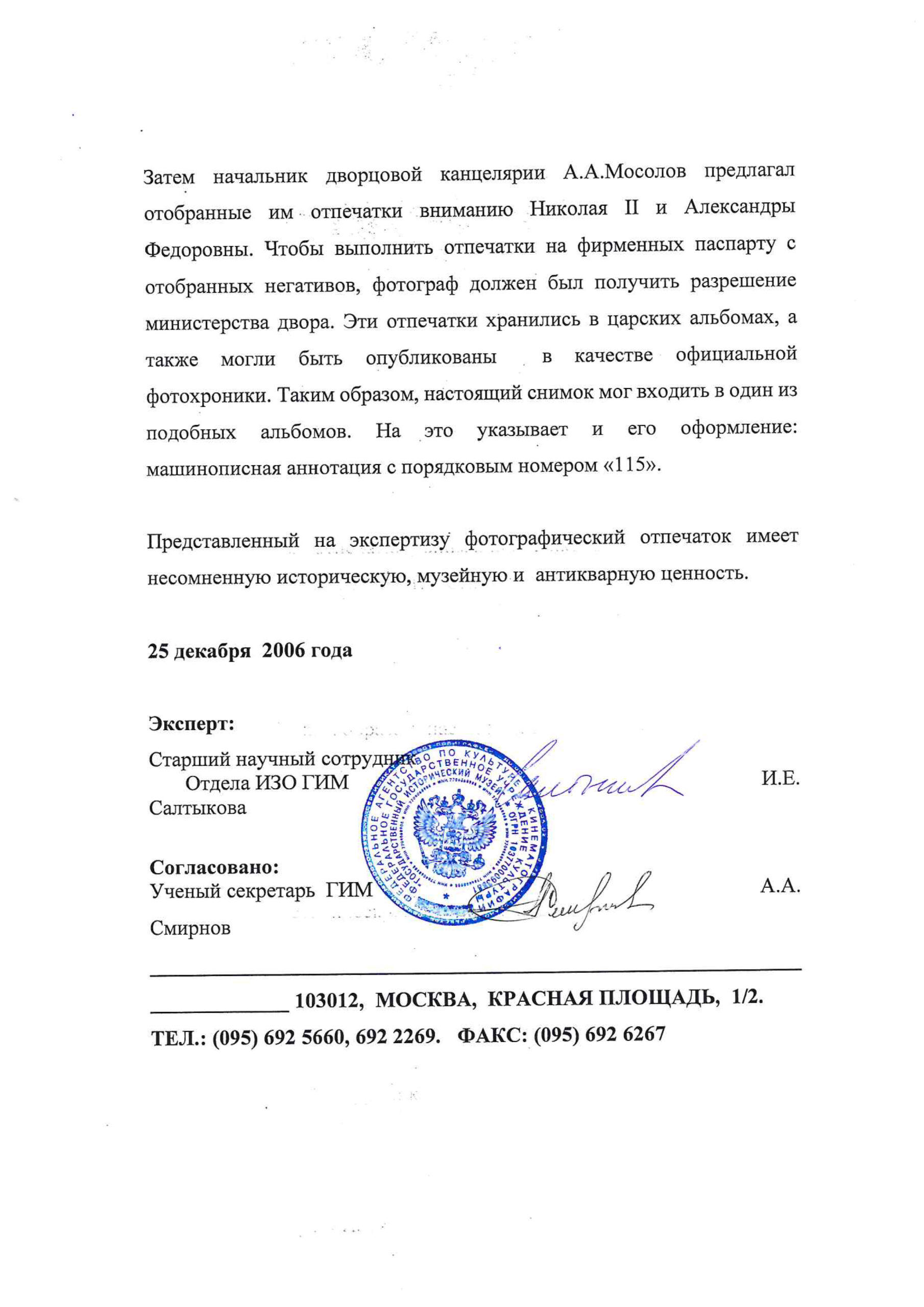 Экспертиза Государственного Исторического музея (2006 г., эксперт И.Е. Салтыкова), приложена реставрационная карточка-паспорт Сектора реставрации фотодокументов ГИМ (2006 г.).