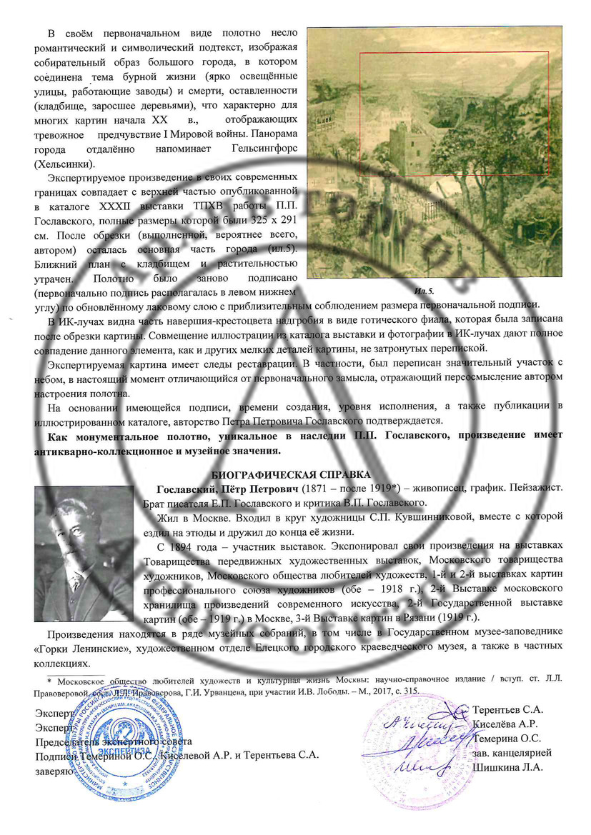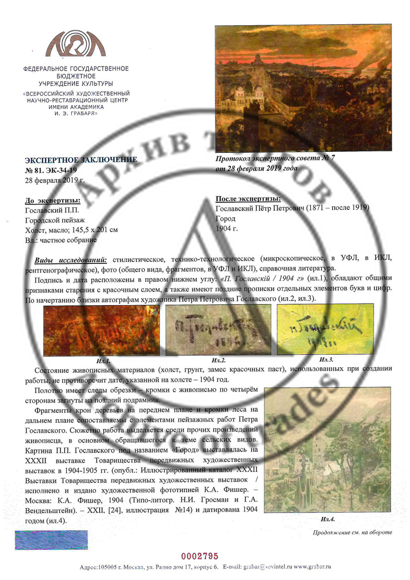 Экспертное заключение ВХНРЦ им. Грабаря (эксперт Терентьев С.А., Киселева А.Р. 2019 год).