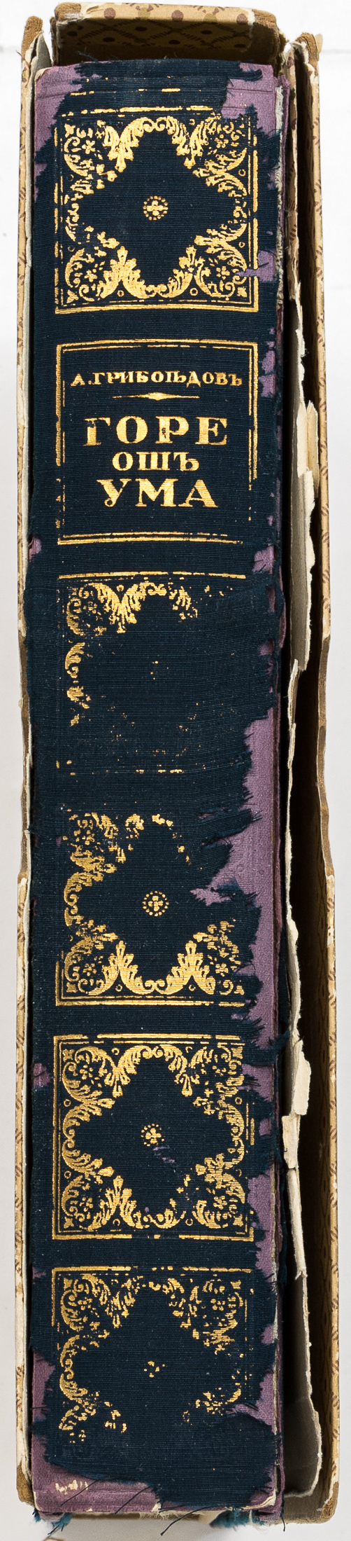 Сохранность: утрата нижнего сегмента футляра, фрагмента верхнего бумажного слоя бокового сегмента футляра, корешка суперобложки и фрагментов ткани на корешке и по краям переплета книги; надрывы и замины суперобложки; трещины по корешку; портрет Грибоедова плохо закреплен в блоке.