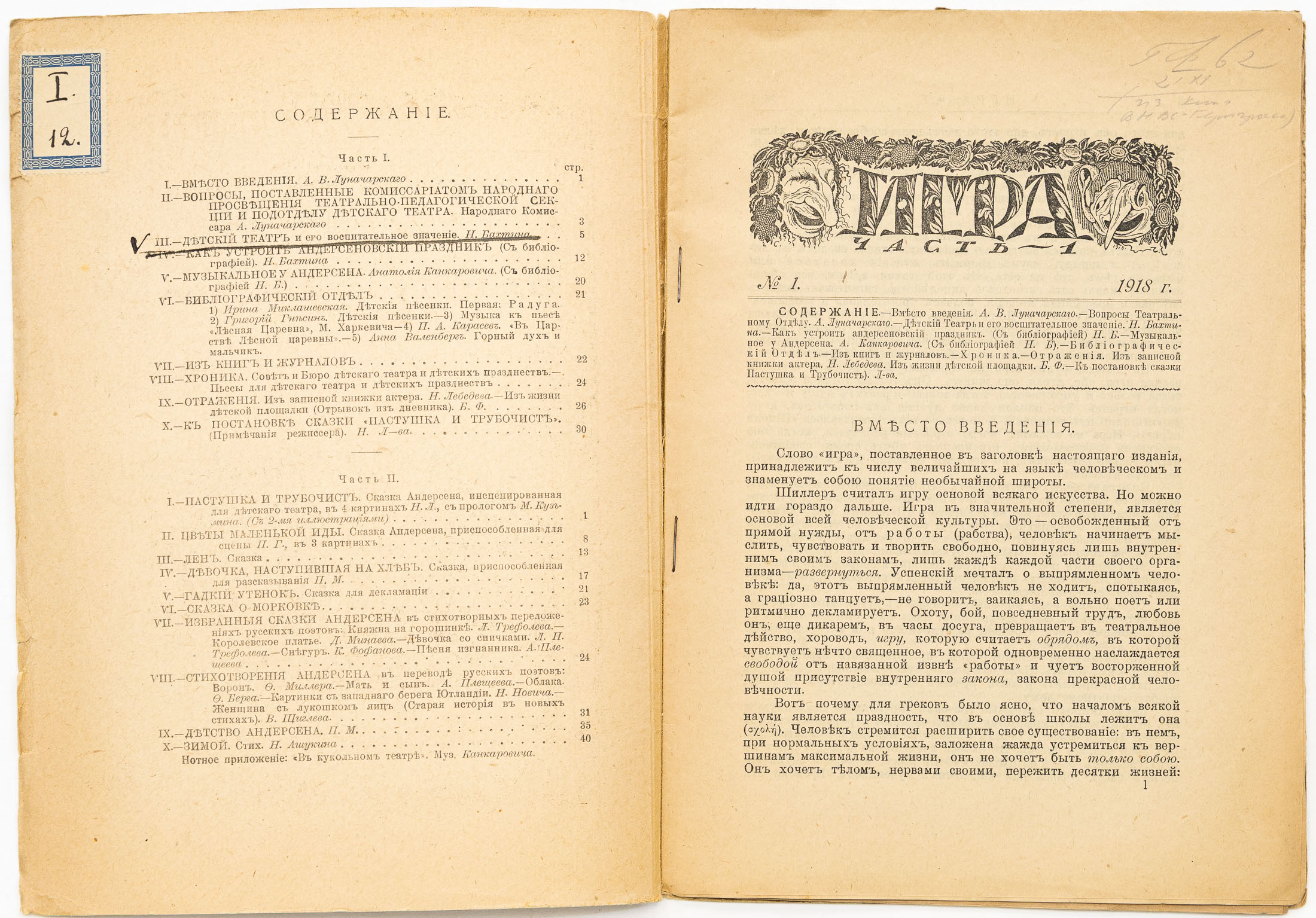 Игра. Непериодическое издание, посвященное воспитанию посредством игры, 1918 №1
