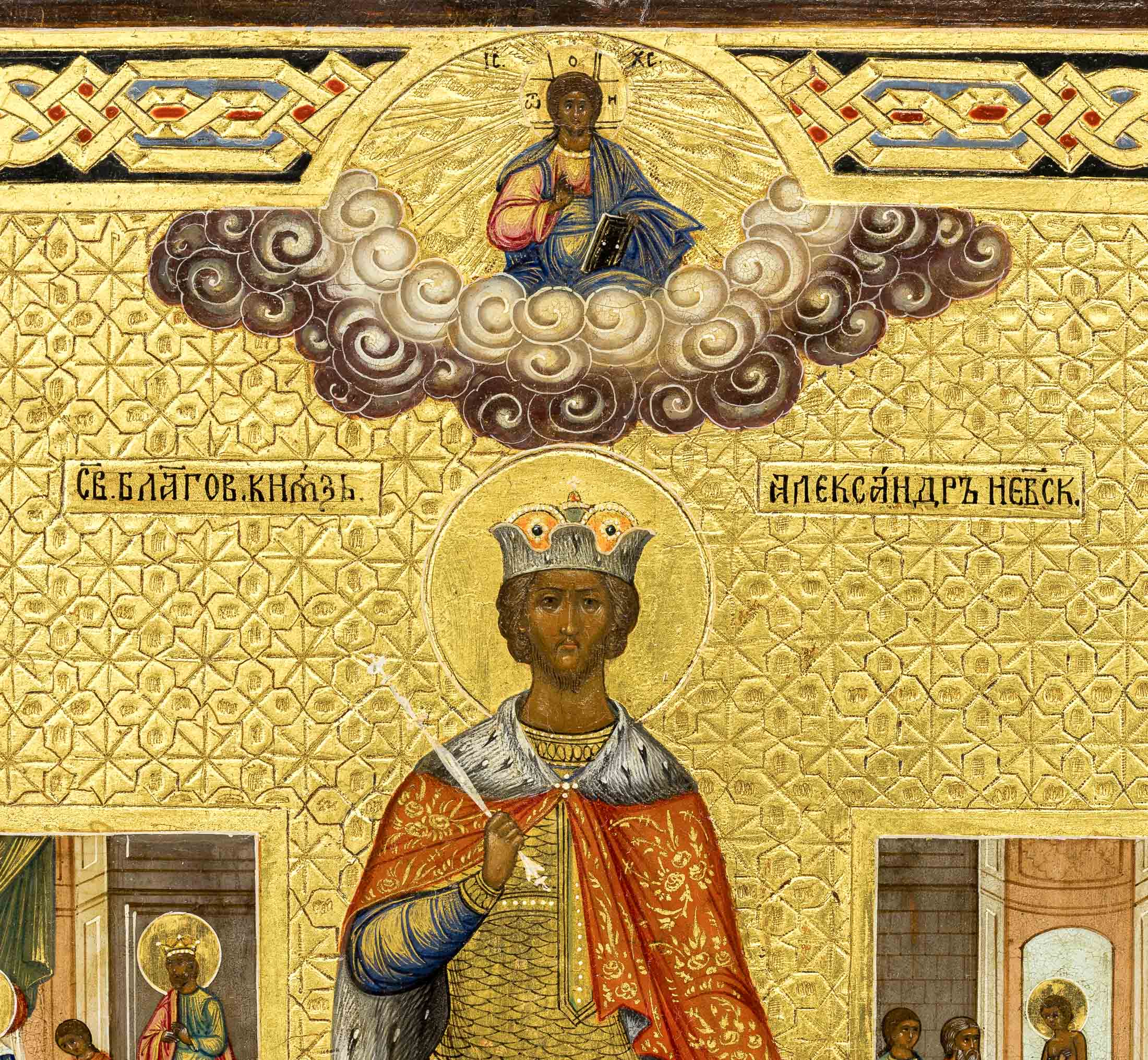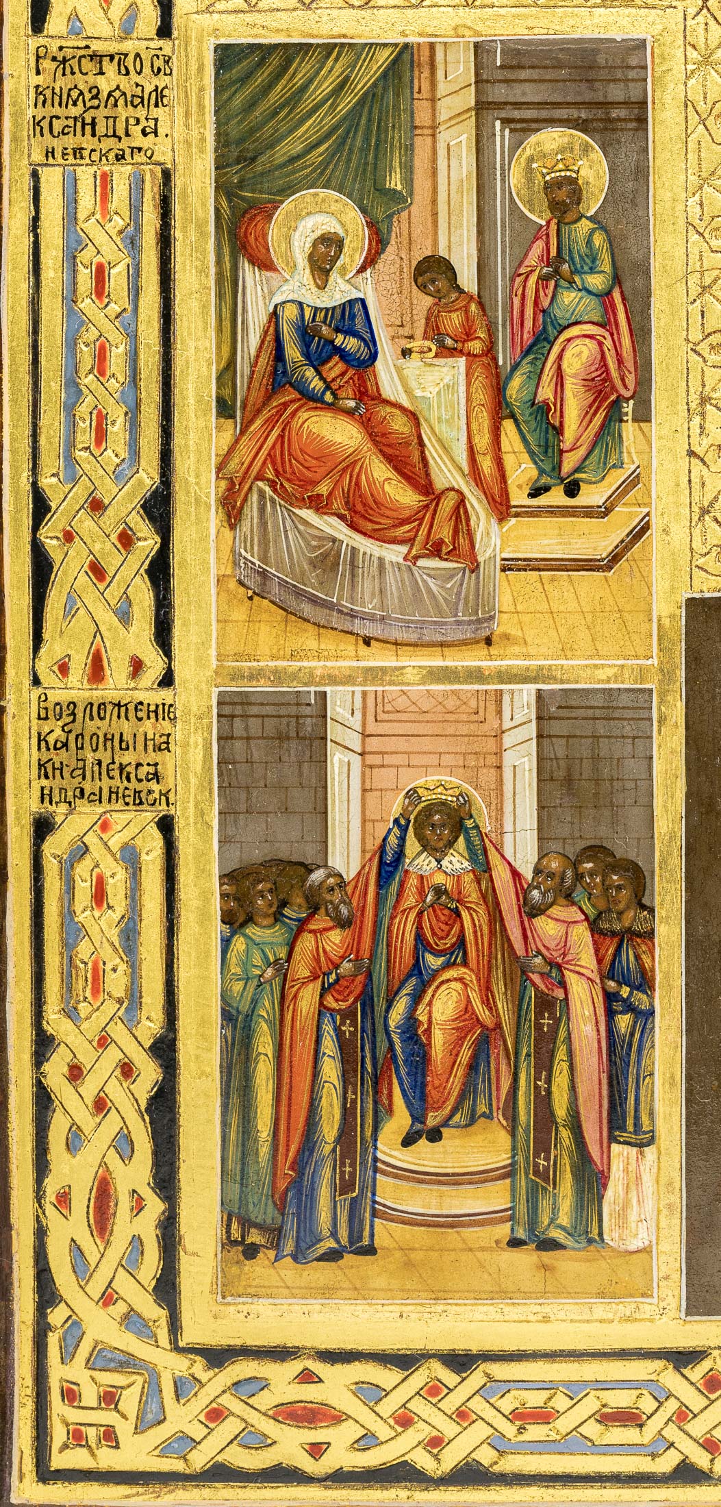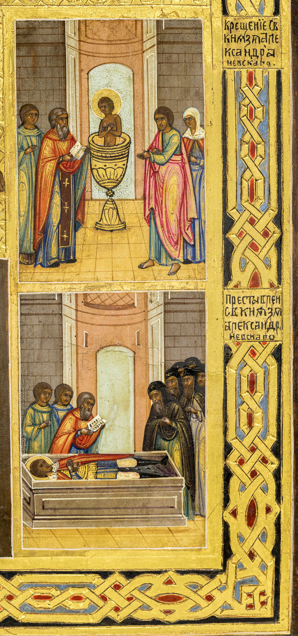 Сцены из жития: «Рождество св. кн. Александра Невского», «Крещение св. князя Александра Невского», «Возложение короны на кн. Александра Невского», «Преставление св. князя Александра Невского».