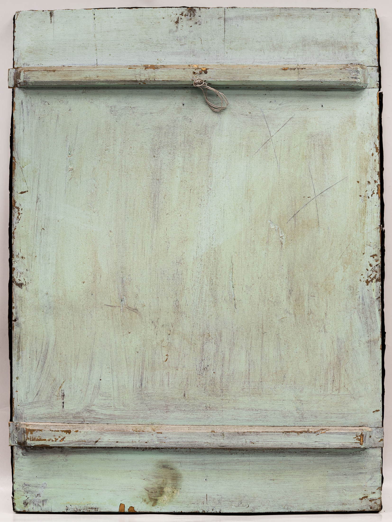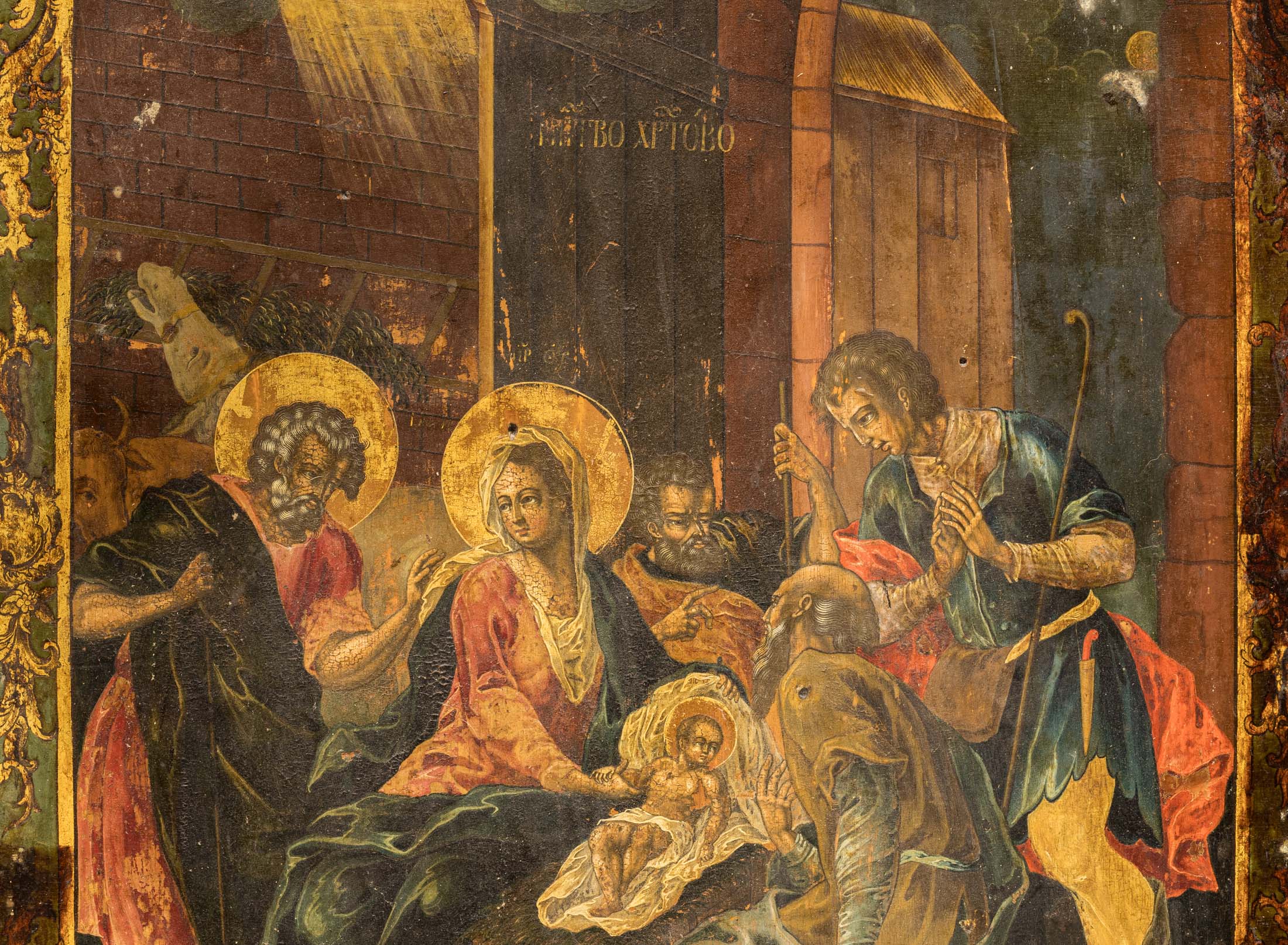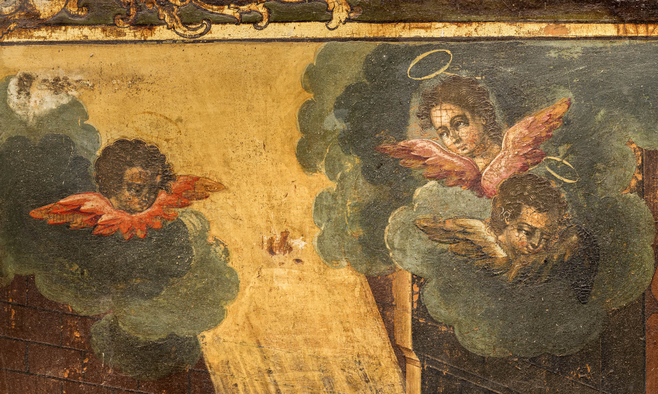 Сохранность: загрязнения, следы реставрации, осыпи, кракелюр, сколы, рассыхания; оклад не прикреплен к иконе, на окладе утрата «цветка», деформация венца, окислы.