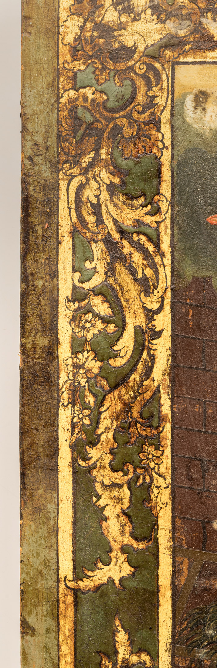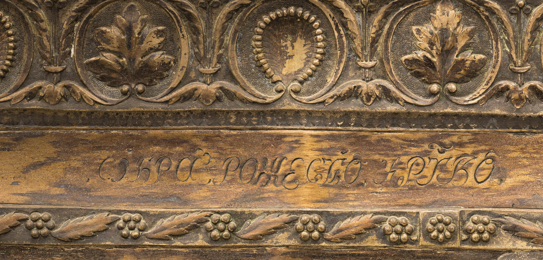 Дерево, левкас, темпера; металл, штамп, монтировка, золочение.