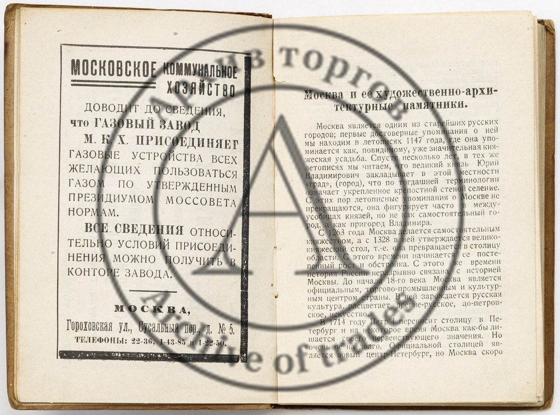 Сохранность: небольшие потертости переплета; утрачены титульный лист, стр. 1/2 и план города; стр. 7-10 плохо закреплены в блоке; небольшие трещины в блоке.