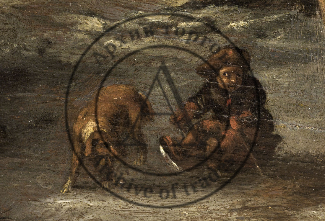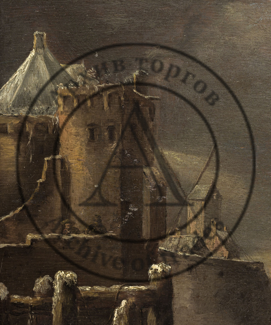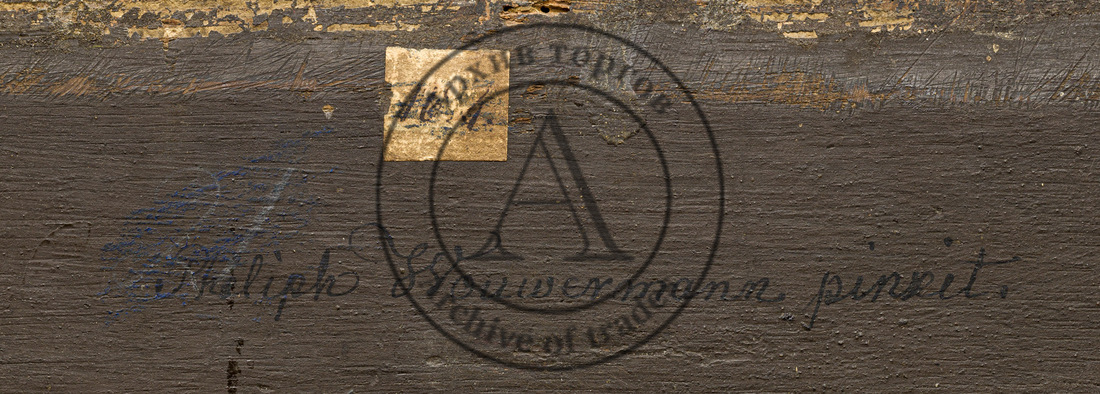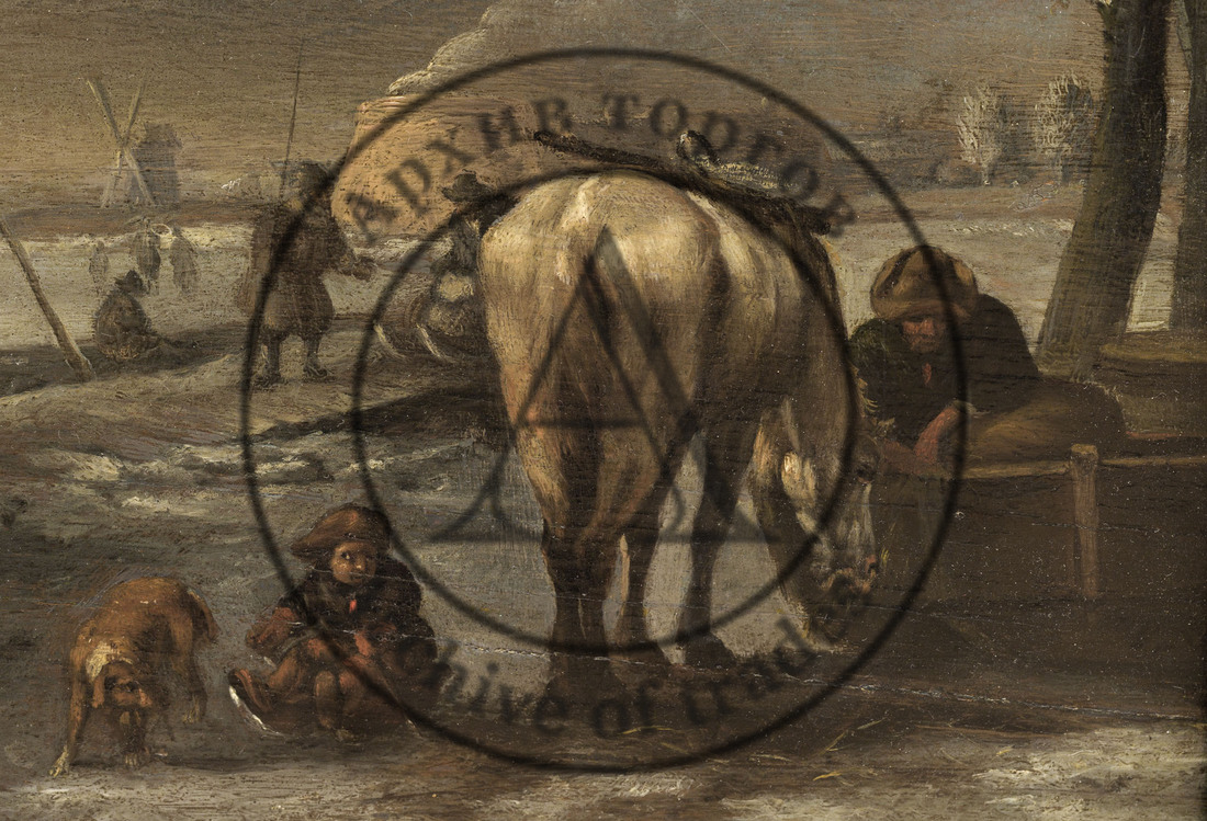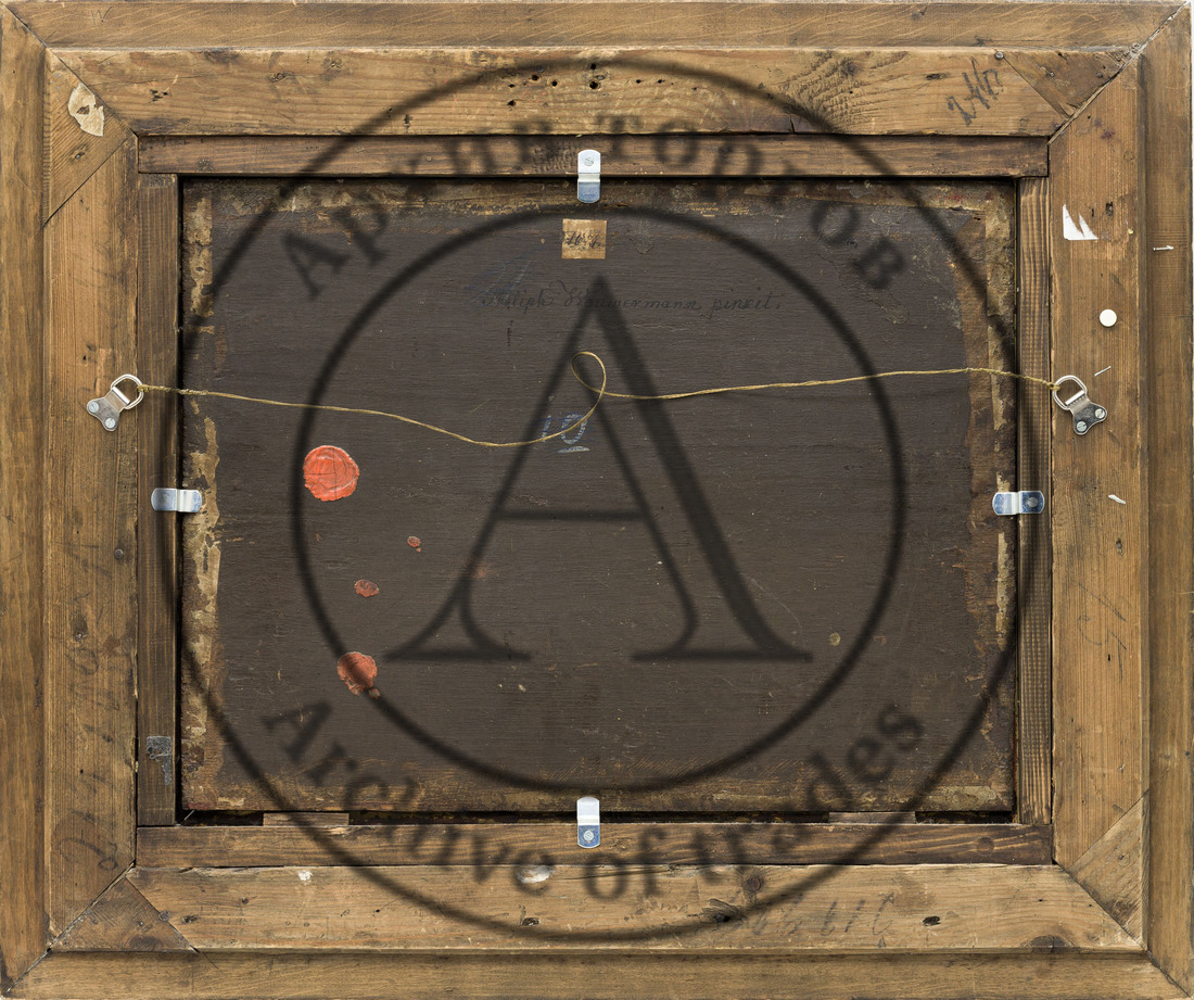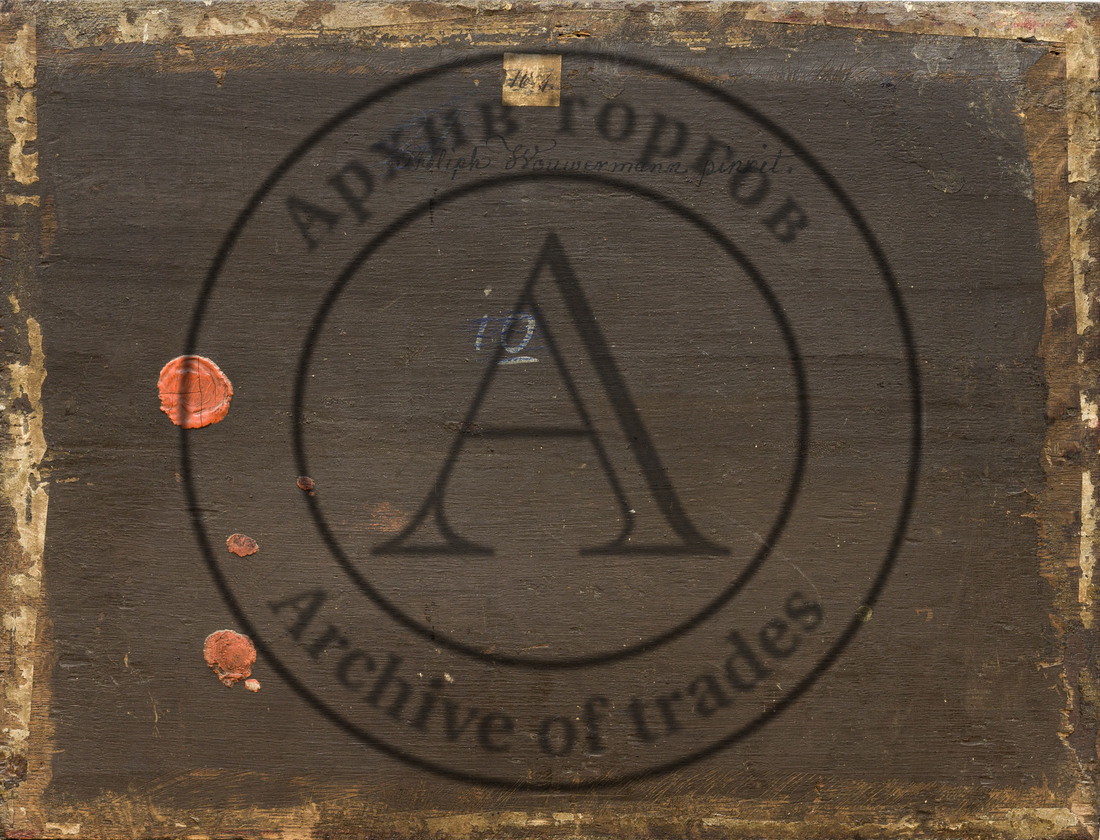 Голландия, сер ХVII века. Дерево, масло. 37 Х 48 см. Монограмма справа внизу. Оформлена в раму. На обороте красная сургучная печать с монограммой FR (IR?), владельческая надпись «Philiph Wouwermann pinxit.»