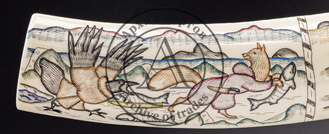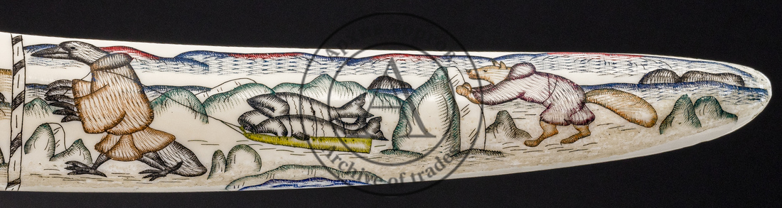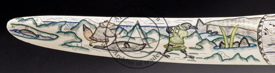 На обеих сторонах клыка слева и справа изображены сцены с лисой и вороном, героями чукотского фольклора: кража лисой рыбы, добыча вороном нерпы, ритуальный обряд. По центру — на одной стороне развёрнута сцена охоты на моржей, на другой — сцена жизни на стоянке (яранга, выпас оленей с помощью лаек, нарты с оленями).