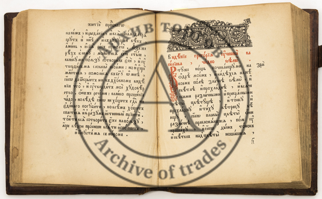 В цельнокожаном переплете с тиснением, на деревянных досках. Церковнославянский шрифт, печать в две краски.