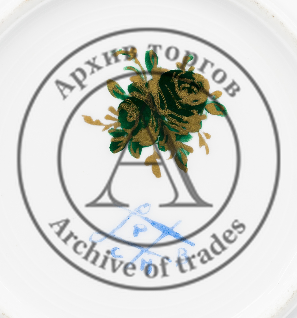 Марки: на чашке и блюдце 1) голубая марка в подражание Севрской фарфоровой мануфактуре; на блюдце 2) изображение зелёных цветов с золочением.